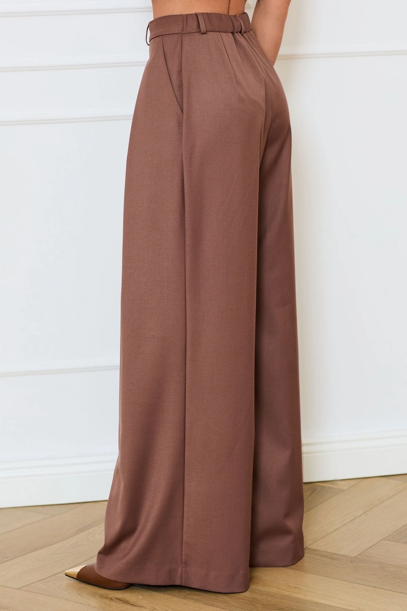 Брюки- расширенного силуэта, с отрезным поясом, застежкой- гульфик. Пояс в области спинки присборен на резинку. В боковых швах расположены карманы. Вход в карман наклонный к боковому шву.