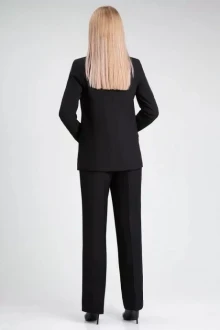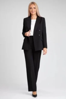 Прямые брюки со стрелками. Высокая посадка на талии. Притачной пояс со шлевками, по спинке сосборен на резинку для комфортной посадки. Застежка на молнию и пуговицу. Спереди косые боковые карманы, по спинке имитация горизонтальных карманов с листочкой.