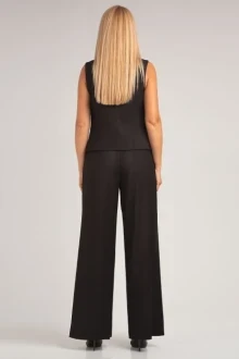 Классические брюки со стрелками, заужены к низу. Притачной пояс со шлевками, по спинке сосборен на резинку. Спереди косые боковые карманы. По спинке имитация горизонтальных карманов с листочкой.