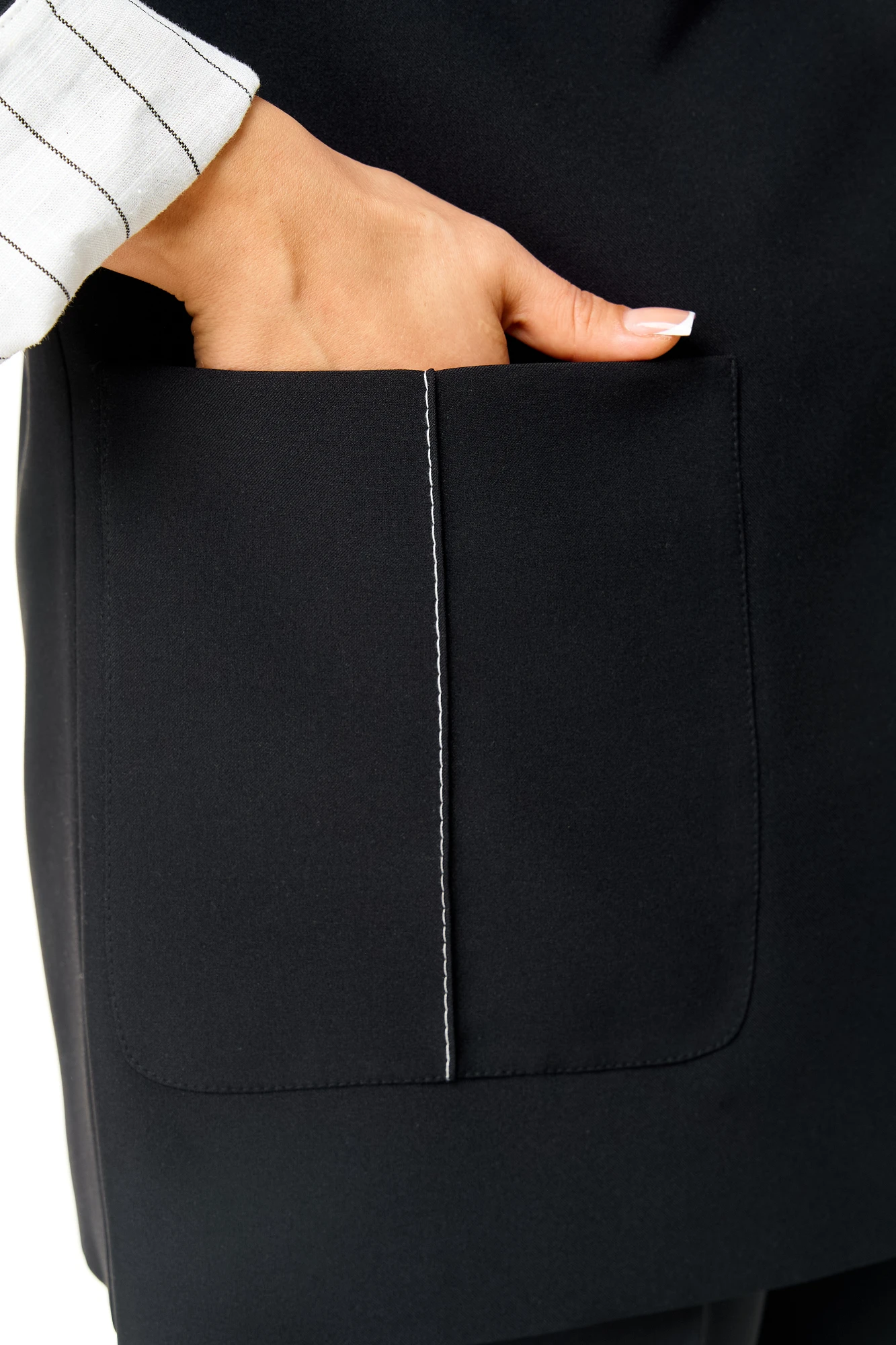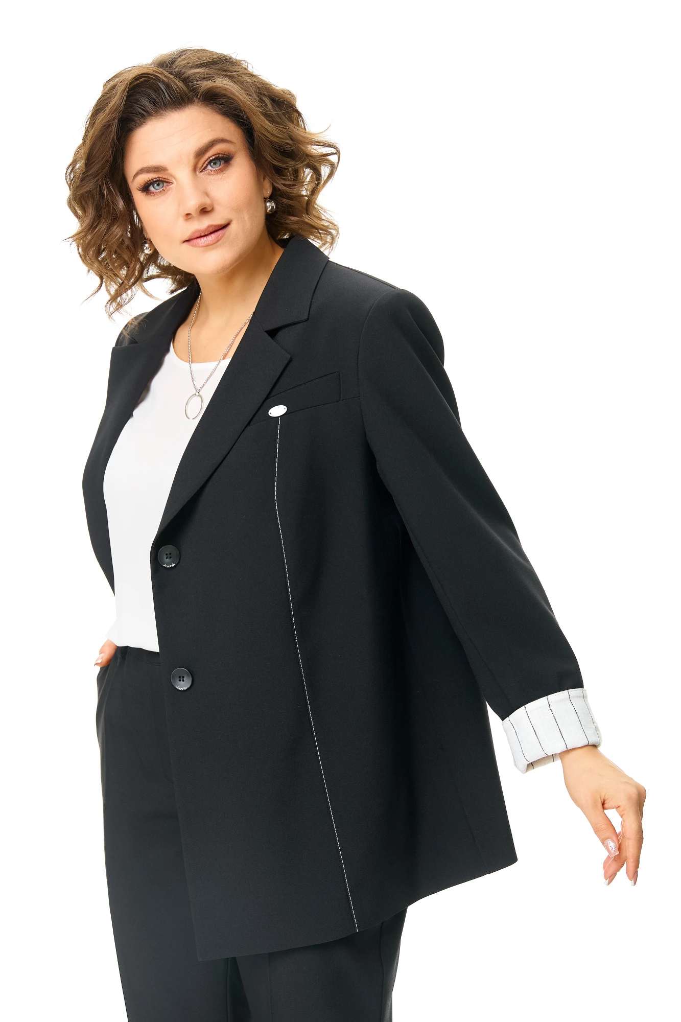 Жакет прямой, полностью на подкладке. По переду выполнен 1 накладной карман с защипом с контрастной отстрочкой. Отделка в виде вертикального шва с контрастной отстрочкой и декоративной листочкой в верхней части переда. Воротник пиджачный. Нагрудная выточка спрятана под воротник. Застёжка центральная на 2 петли и пуговицы. Рукав втачной двушовный. Низ рукава выполнен с контрастной отделкой, может отворачиваться как манжет.