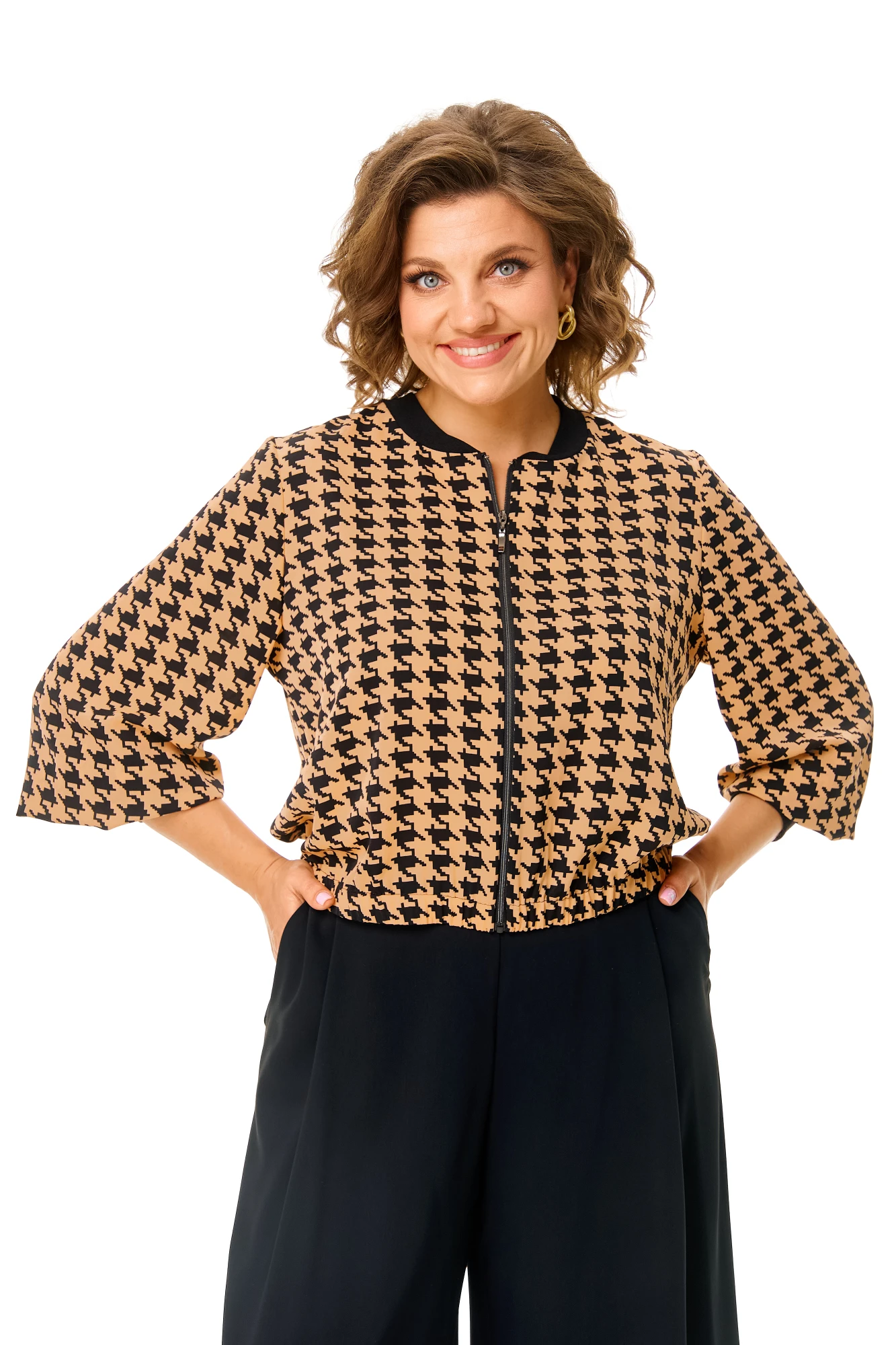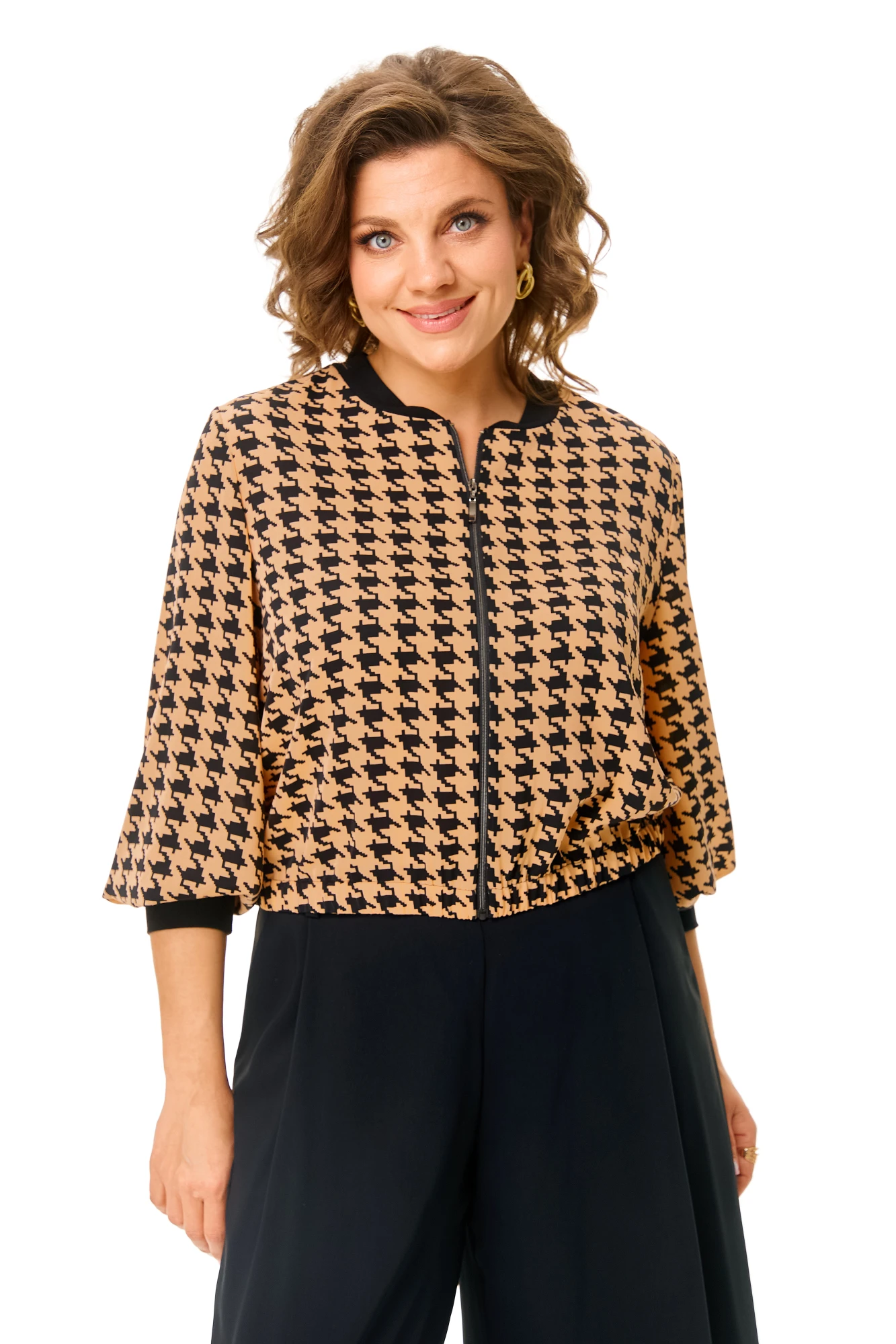 Бомбер выполнен из плательно-блузочной ткани. Воротник круглый типа довяза. Рукав втачной. Застёжка центральная на тесьму молнию. Спинка без особенностей. По низу бомбера Кулиска.