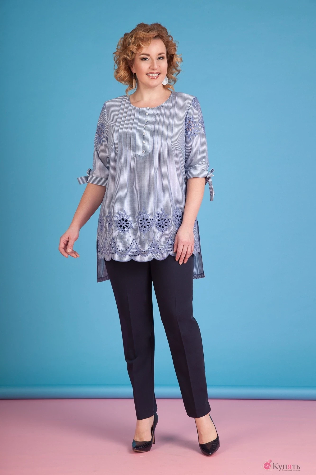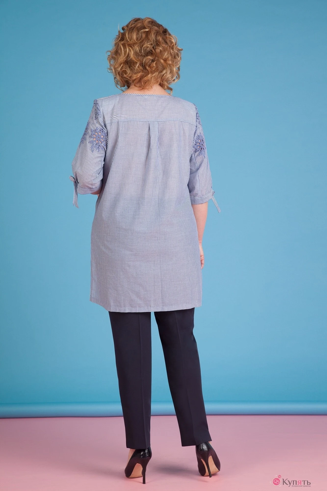Стильная летняя туника из хлопковой ткани в мелкую полоску с кружевом. Модель с округлым вырезом горловины, с застежкой на планки с навесными пуговками в виде кристаллов. По полочке застрочены декоративные защипы. Рука втачной, средней длины с притачной манжетой, концы которой, можно завязать на бант. Спинка на кокетке. По центру заложена бантовая складка. Низ изделия фигурный; спинка длиннее, чем полочка. По боковым швам понизу предусмотрены разрезы. Идеальная вещь для жаркой летней погоды.Брюки классической длины, «слегка» зауженные к низу, на притачном поясе с гульфиком и молнией, есть резинка в поясе.