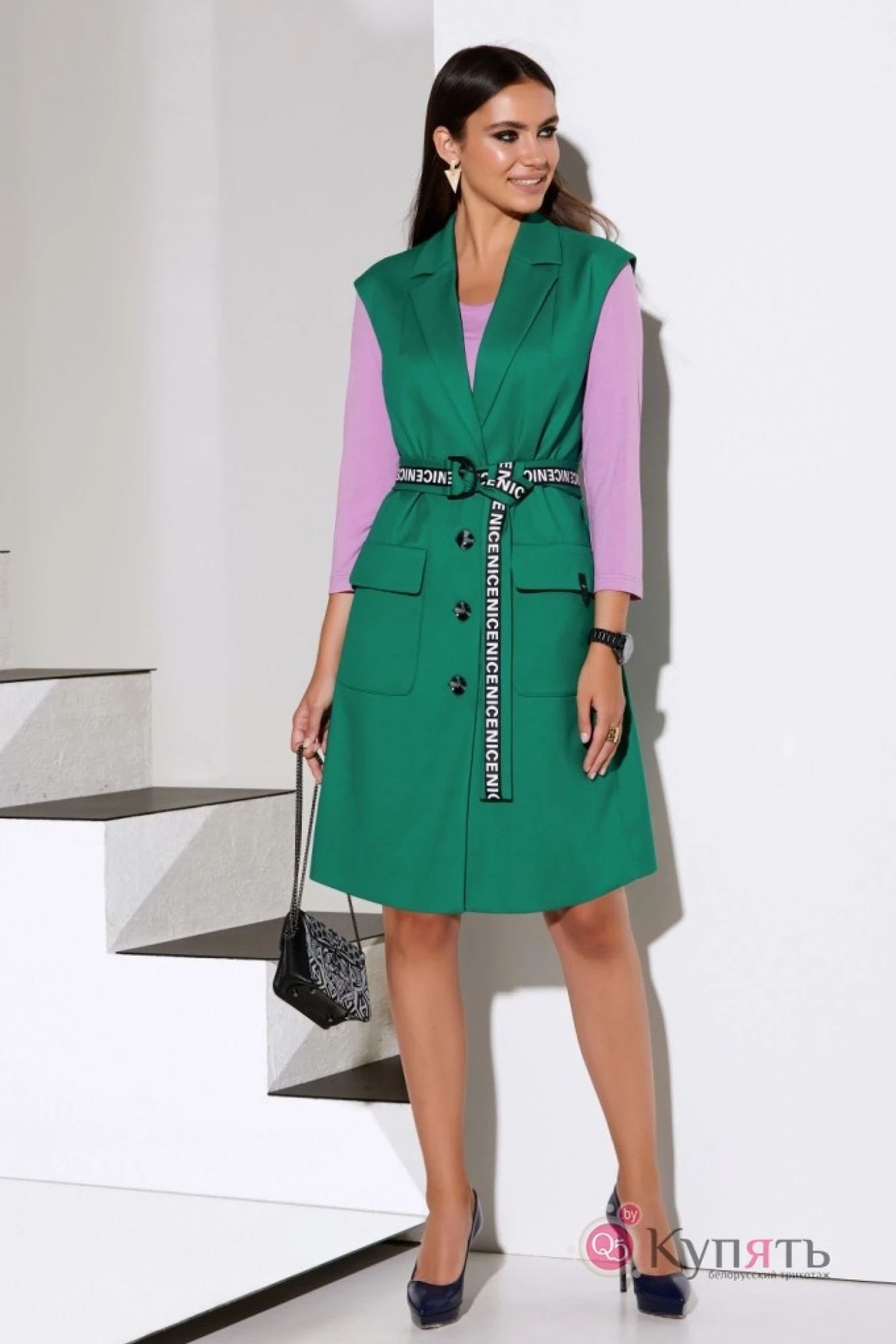46,48,50Жилет с воротником пиджачного типа, спущенной линией плеча и центральной застёжкой на петли и пуговицы. На уровне талии съёмный пояс из основной ткани и настроченной тесьмой по нему. Перед с накладными карманами с клапанами в нижней части. Спинка с талиевыми вытачками. Жилет на подкладке. Блуза с округлым вырезом горловины. Рукава втачные. Брюки на притачном поясе. По низу брюк шлицы с пуговицами.