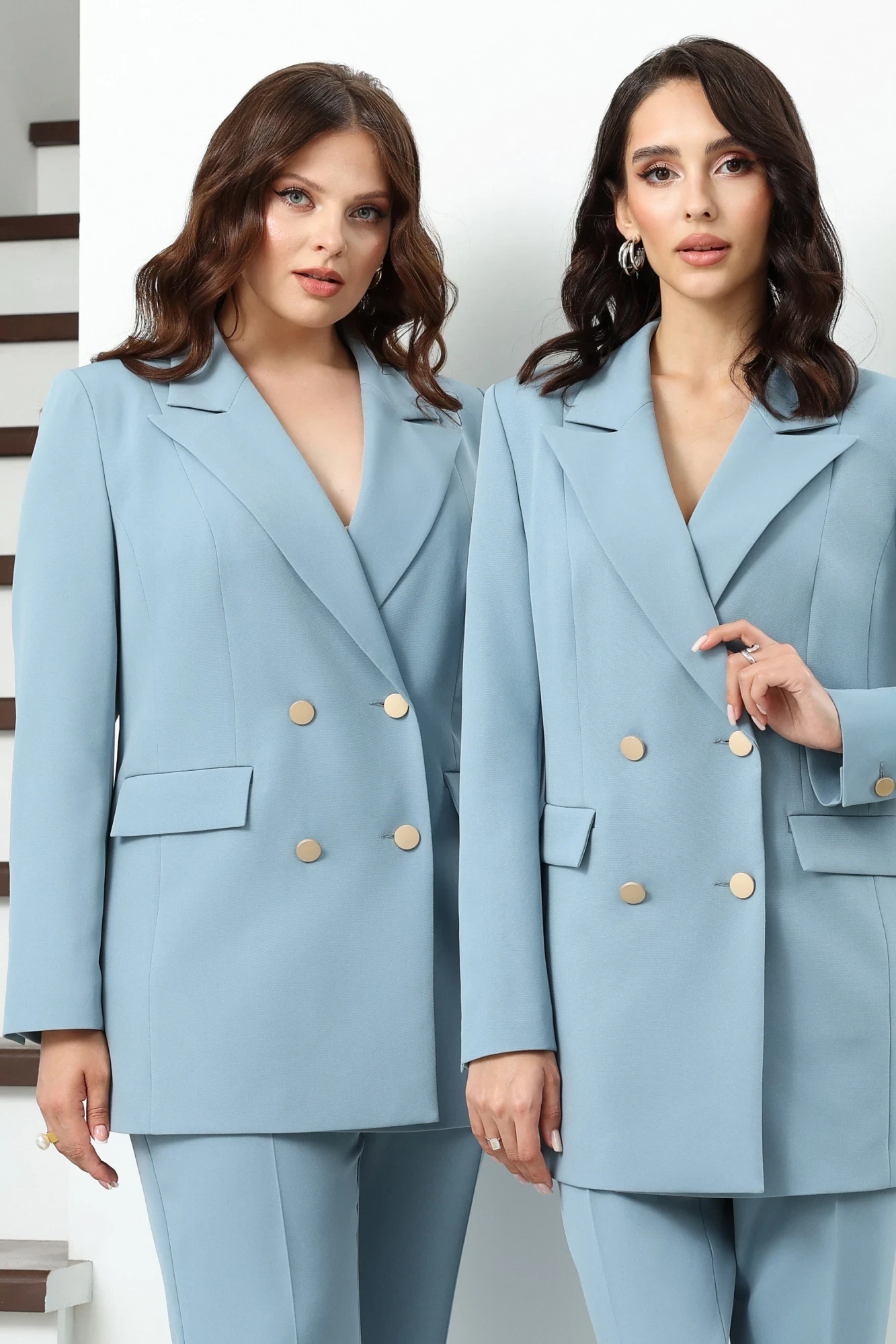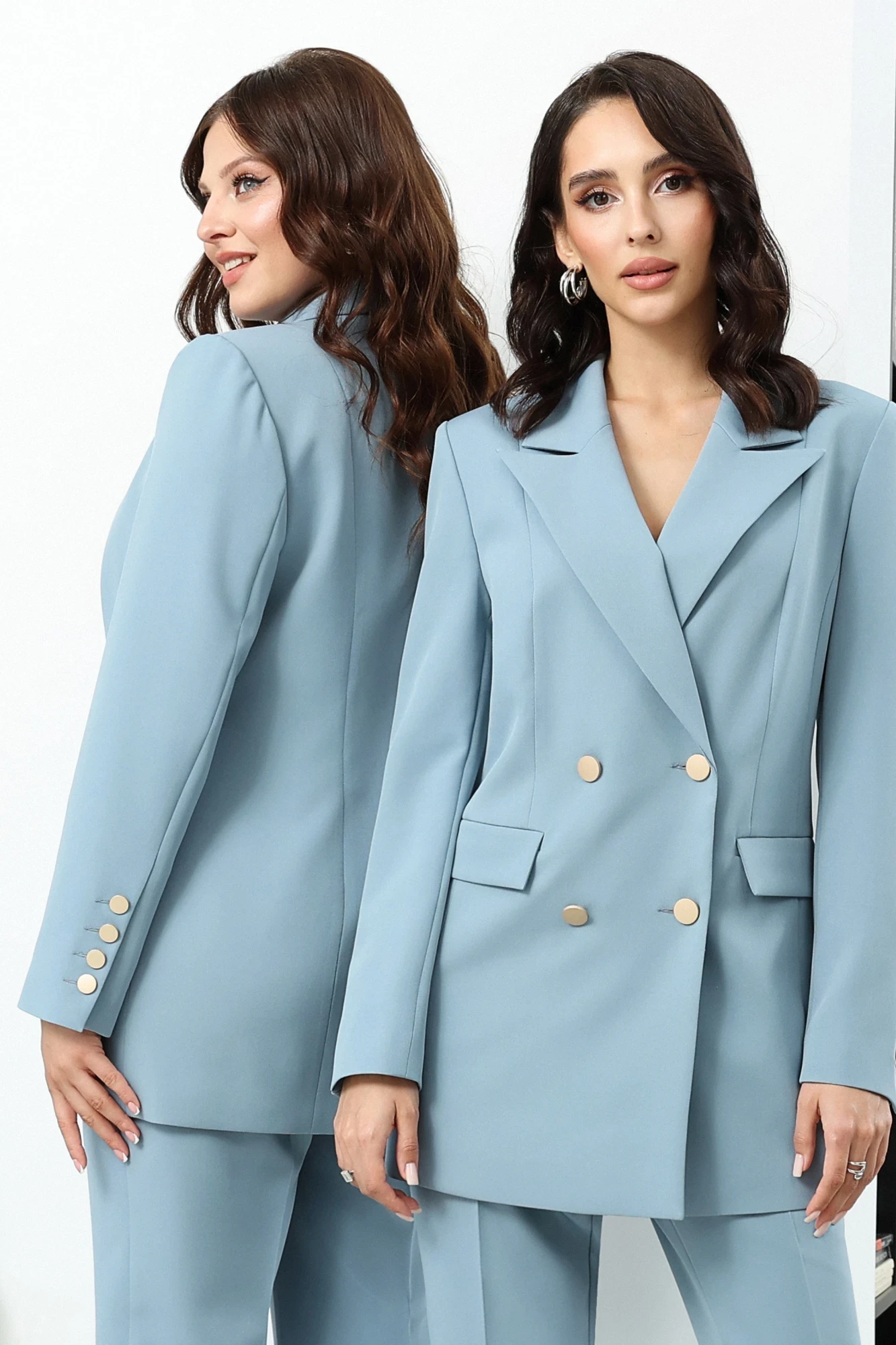 46,48,50,52,54Жакет со стояче - отложным воротником пиджачного типа и двубортной застёжкой на петли и пуговицы. Перед с карманами с клапанами в нижней части и рельефами. Спинка со средним швом и двумя рельефами. Рукава втачные, со шлицей и пуговицами по низу. Жакет на подкладке.