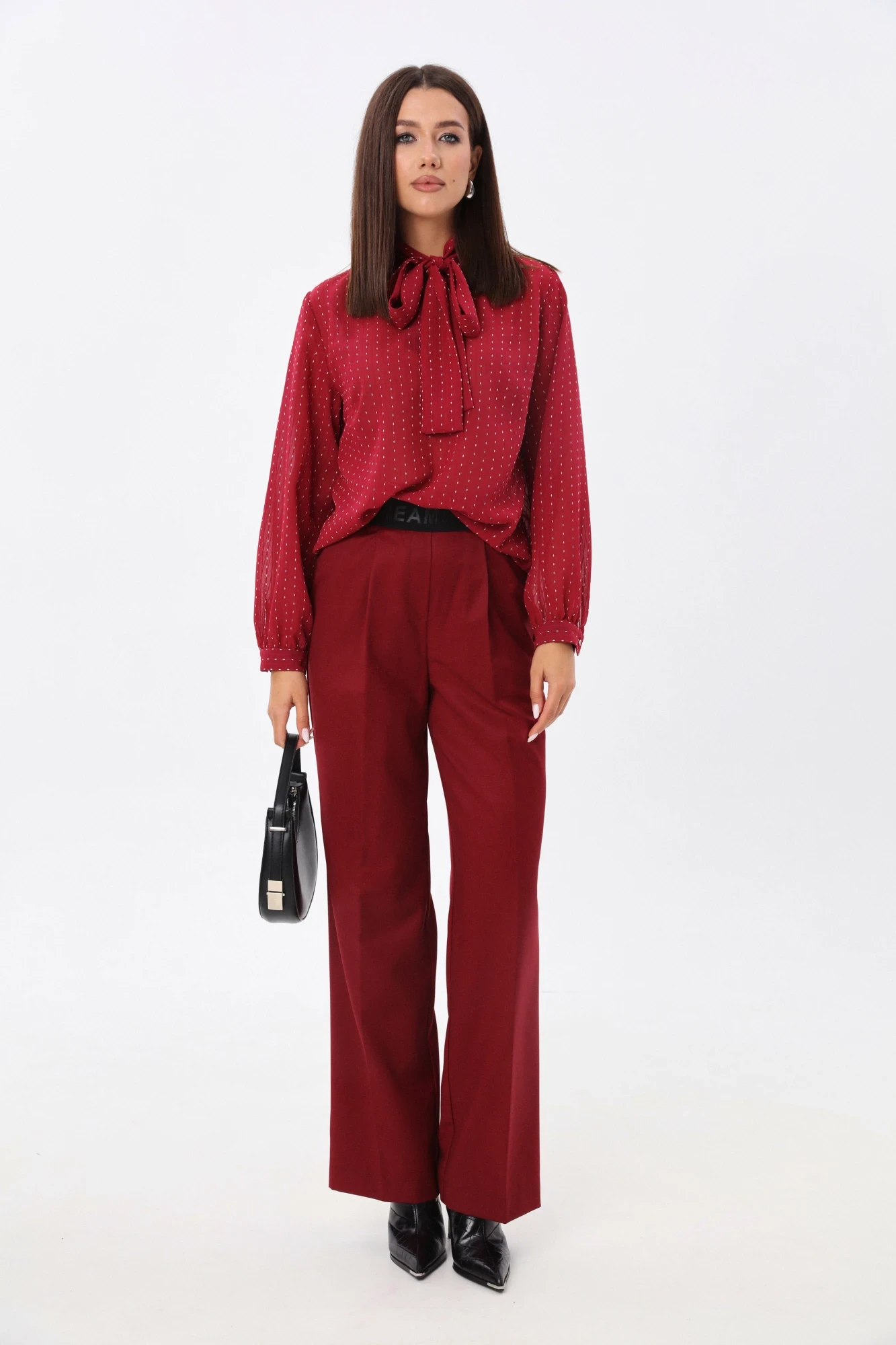 Отделка горловины рюшами и красивым бантом по спинке делает блузку отличным вариантом для нарядного и романтичного образа!
