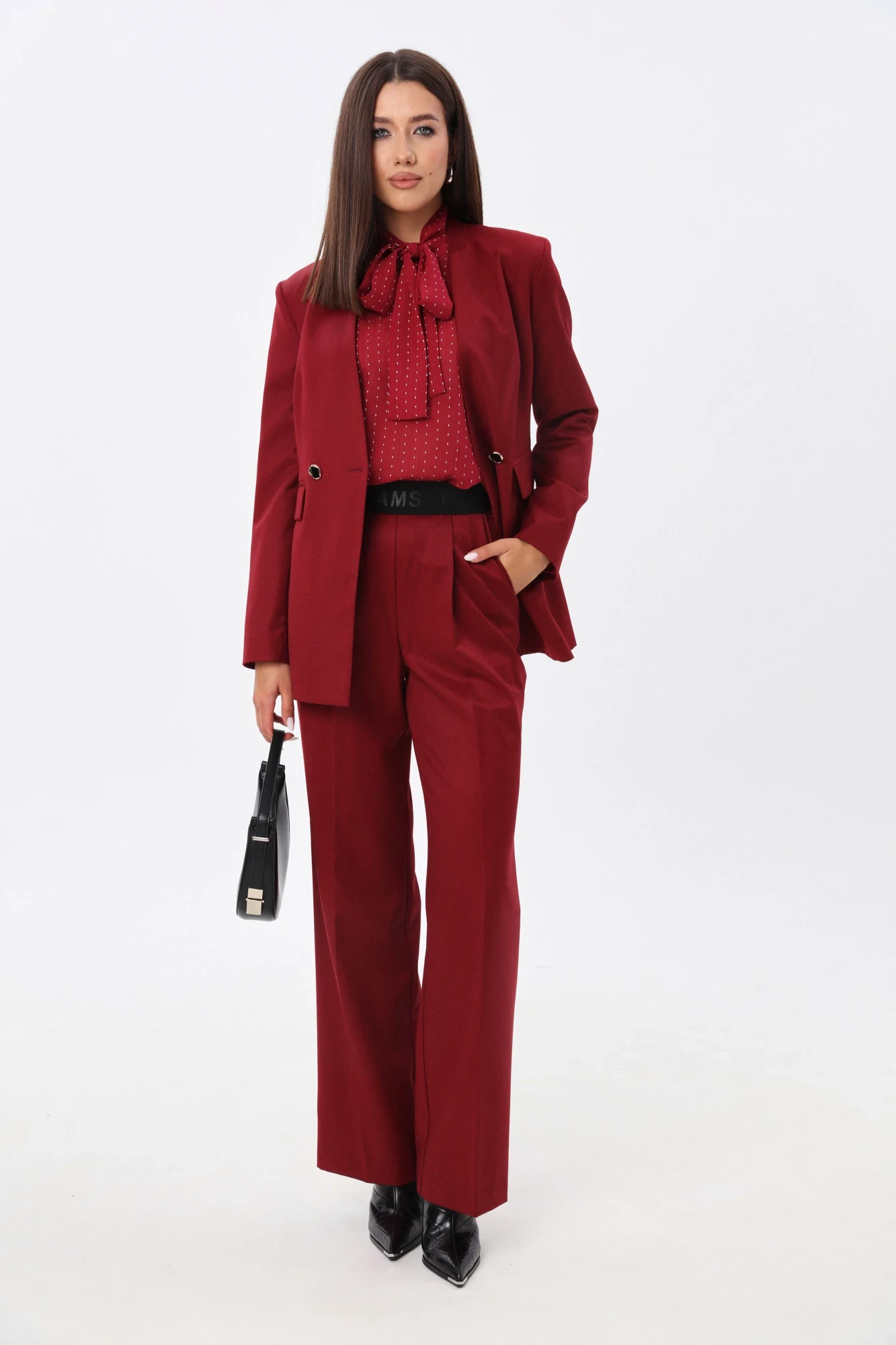 Брюки широкого объема, прямого силуэта. На передних половинках брюк заутюжены стрелки, переходящие в складки по линии талии. На задних половинках также заутюжены стрелки. В боковых швах расположены карманы. Пояс брюк на эластичной тесьме, в боковом шве вставлена молния. По переду имитация застёжки-гульфика. Рост фотомодели 175 см. Размер у фотомодели – 44.