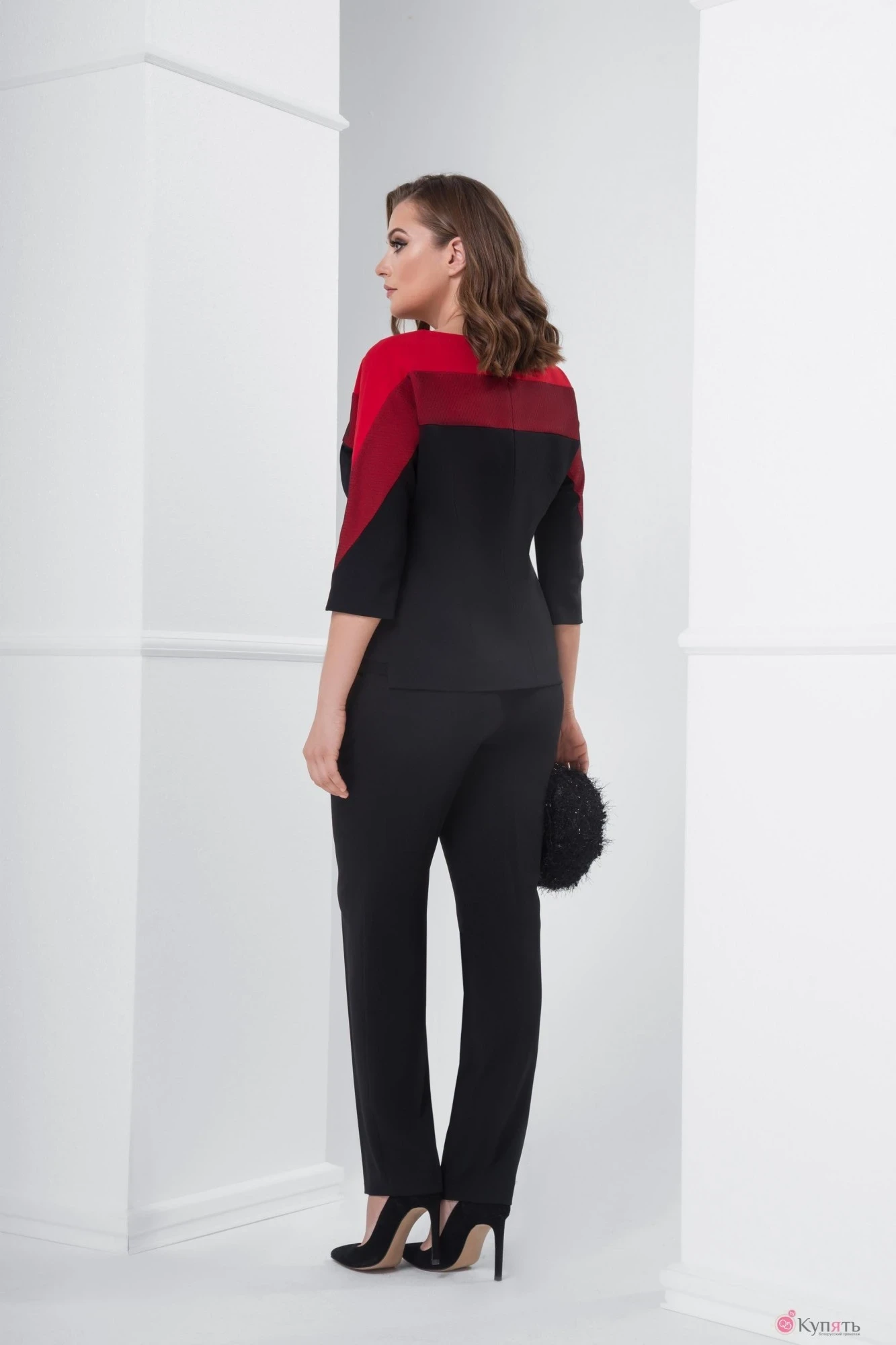 Современный комплект для женщин, предпочитающих деловой стиль. Этот вариант комплекта подойдёт для работы в офисе или деловой встречи, а также будет актуален для торжественных случаев. Костюм из костюмно-плательной ткани "ZARA", состоящий из жакета и брюк. Жакет полуприлегающего силуэта с цельнокроеным рукавом 3/4. По переду рельефы для лучшего облегания по фигуре, по спинке жакета застежка на потайную тесьму-молнию в среднем шве и две вытачки. Стильным элементом костюма являются горизонтальные подрезы по переду и спинке с наложением дизайнерской сетки, а так же съемная дизайнерская брошь. Перед низа жакета короче спинки на 4 см и оформлен сеткой. Вырез горловины круглый. Брюки – классические, прямые, зауженные книзу, на поясе-кокетке. По передним половинкам брюк функциональные карманы в боковых швах, застежка на тесьму-молнию и две пуговицы.