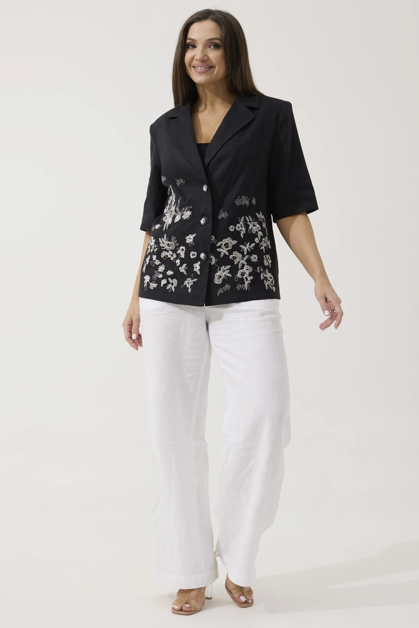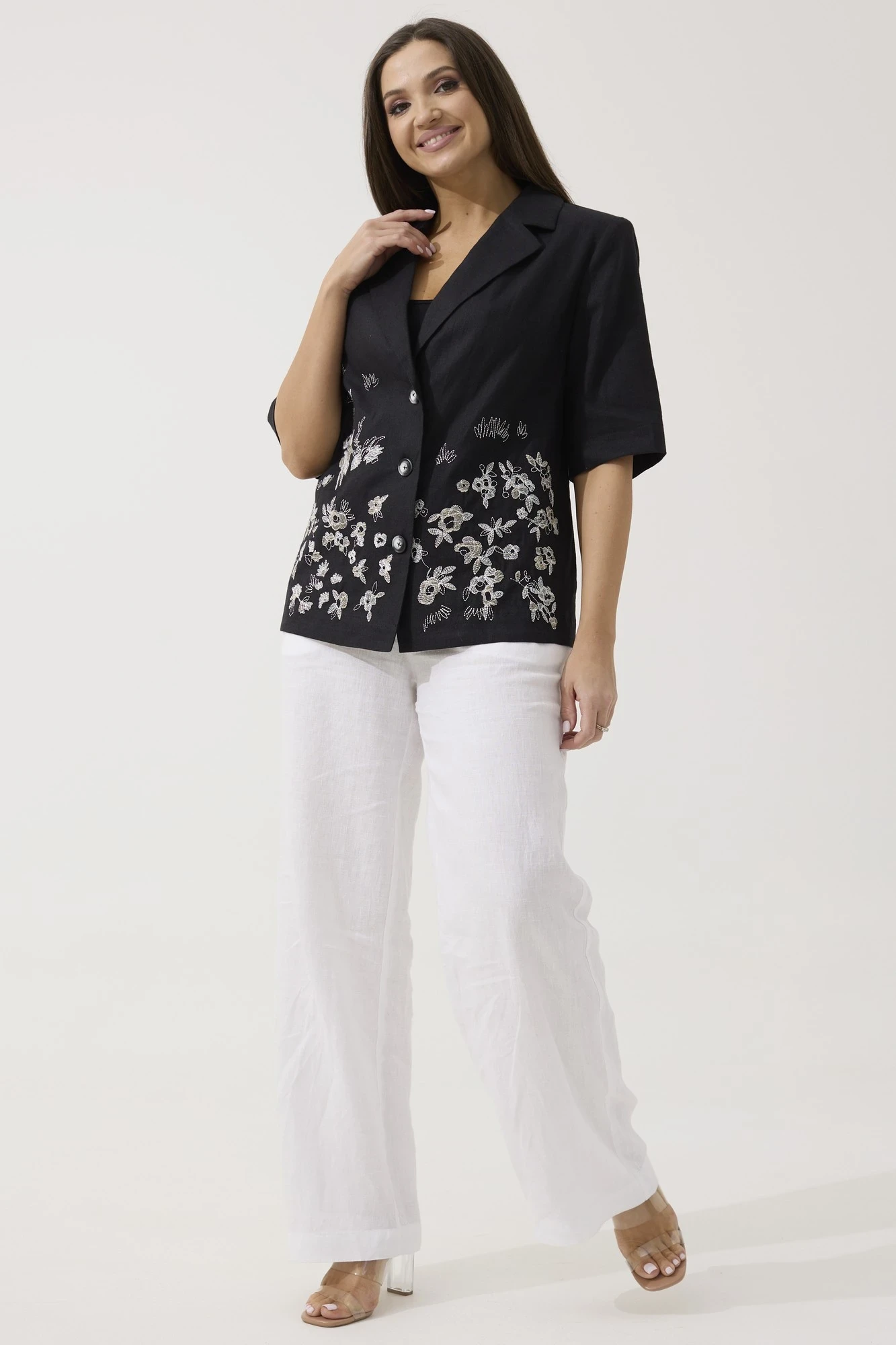 Жакет свободного силуэта. Воротник пиджачного типа, застежка центральная на три петли и пуговицы. Снизу полочки декоративная дизайнерская вышивка. Спинка со средним швом, который заканчивается шлицей. Рукав одношовный втачной, длиной по локоть.