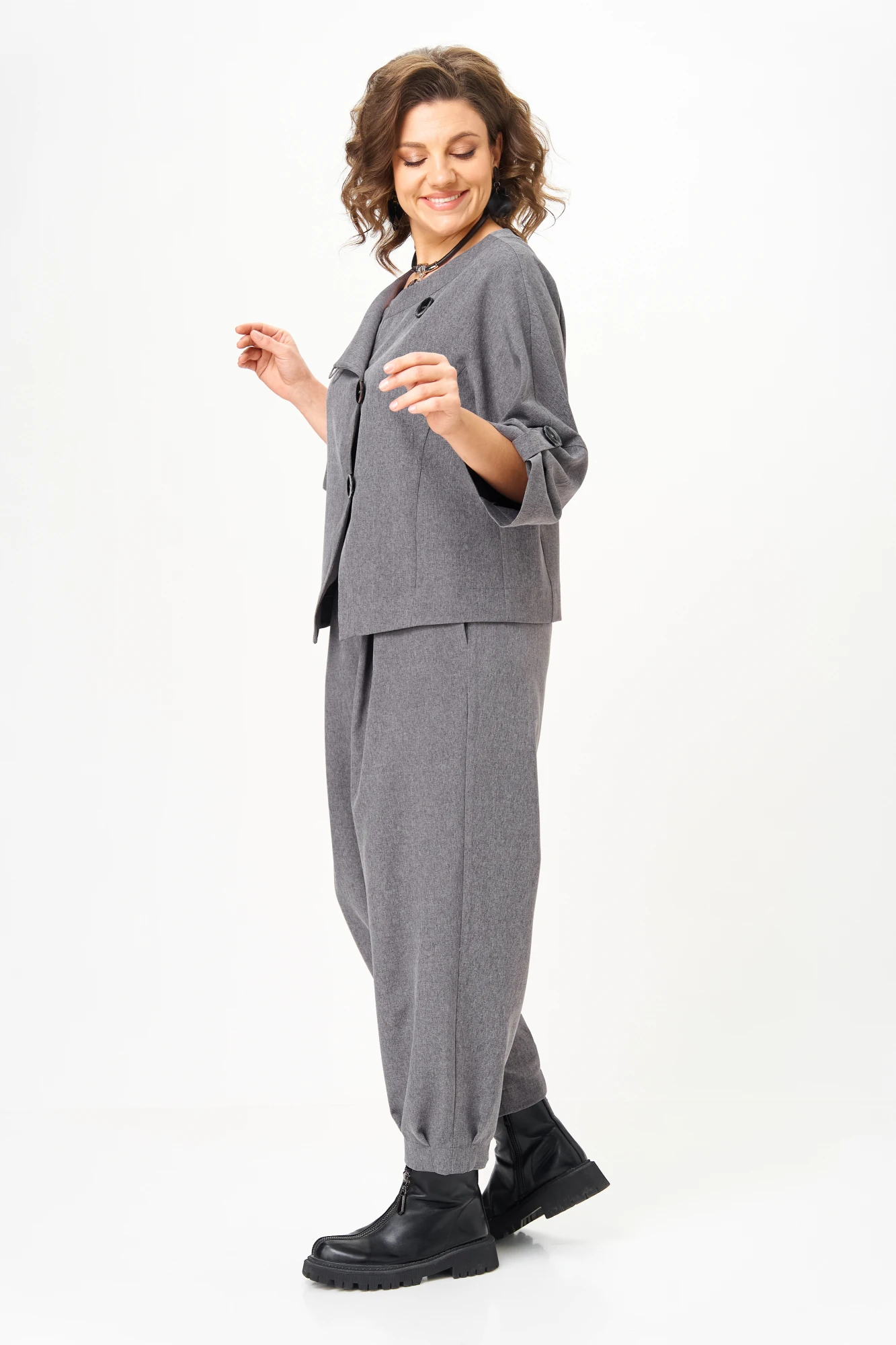 Универсальный костюм, который выглядит дорого и современно, но при этом дарит комфорт и лёгкость. Его можно носить как комплект или по отдельности: жакет с асимметричной застёжкой и акцентными пуговицами легко сочетается с джинсами, а брюки свободного кроя идеально смотрятся с блузой или футболкой.