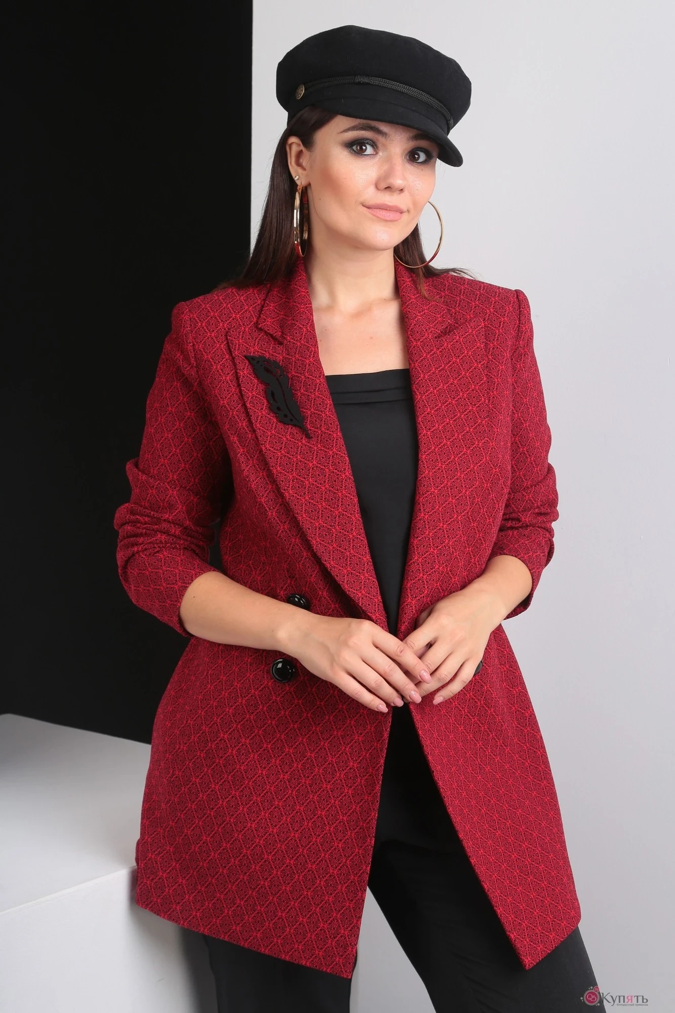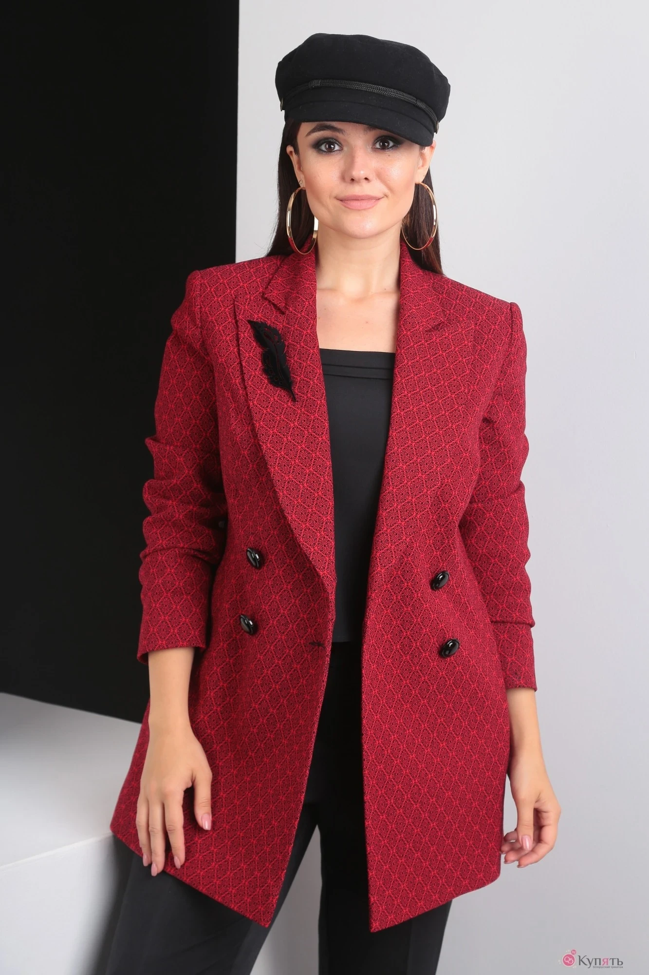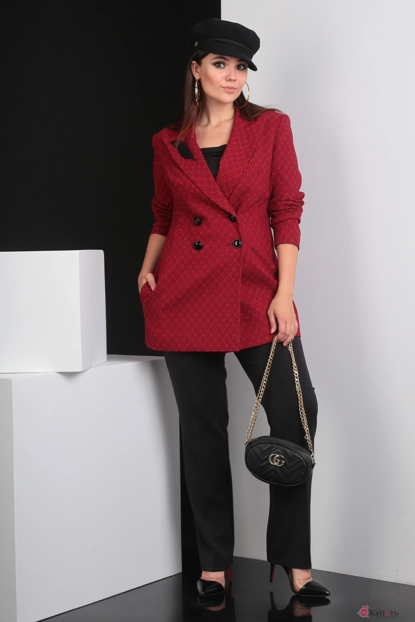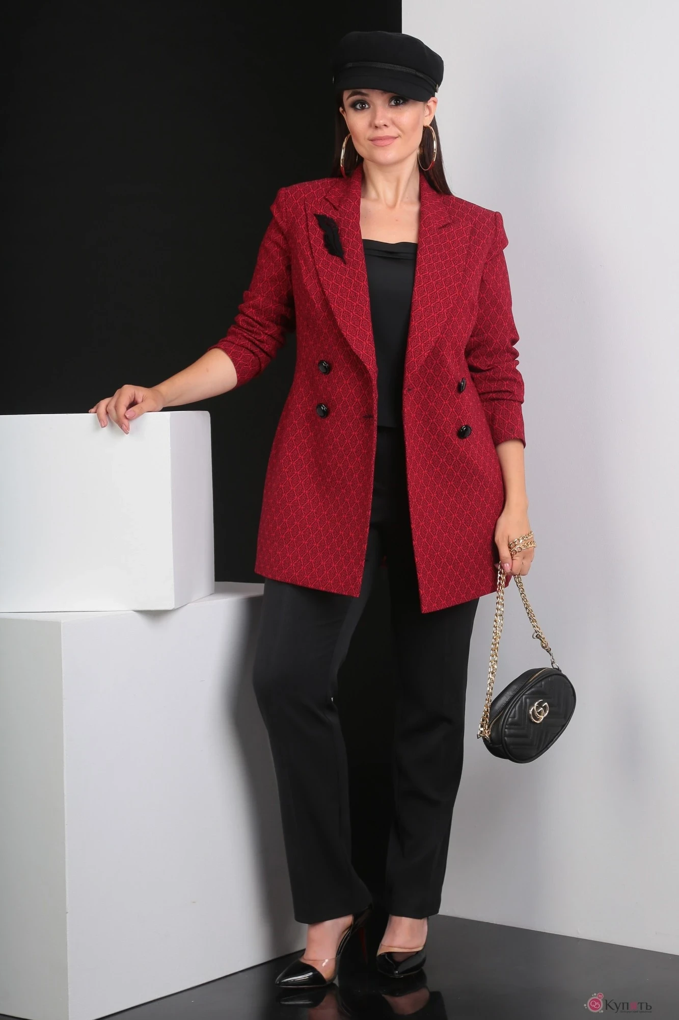 Костюм женский, приталенного силуэта, состоит из удлиненного жакета и брюк. Жакет двубортный. По переду рельеф с вытачкой, выходящий из проймы. Спинка со средним швом и двумя рельефами. Рукав втачной 2-хшовный. В боковых швах карманы. Брюки прямые со стрелкой. По переду брюк карман с отрезным бочком, застежка на тесьму-молнию.