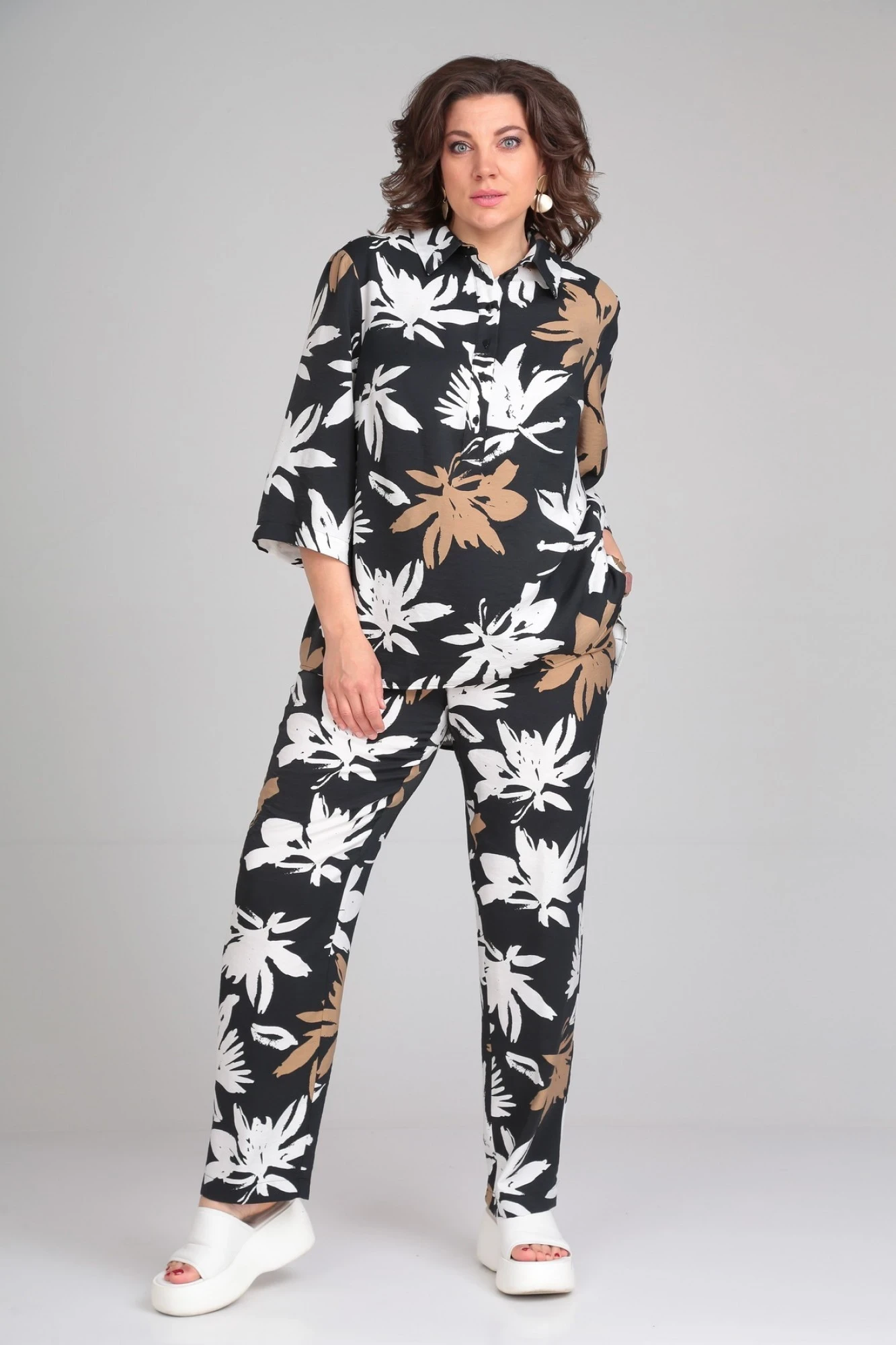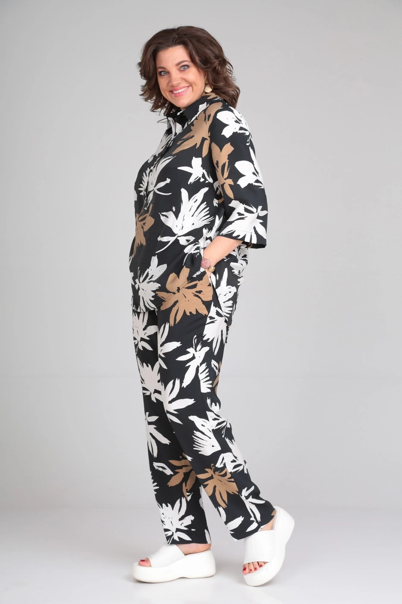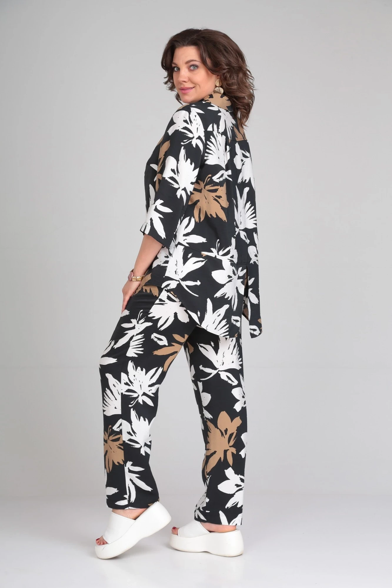 Блуза свободного силуэта с модным принтом. По переду центральная застежка на петли-пуговицы. По спинке отрезная кокетка, от которой заложена складка для свободы движения. В нижней части спинки горизонтальный подрез с разрезом по середине. Низ блузы фигурной формы. Горловина оформлена рубашечным воротником со стойкой. Рукав втачной, одношовный, длиной ¾.