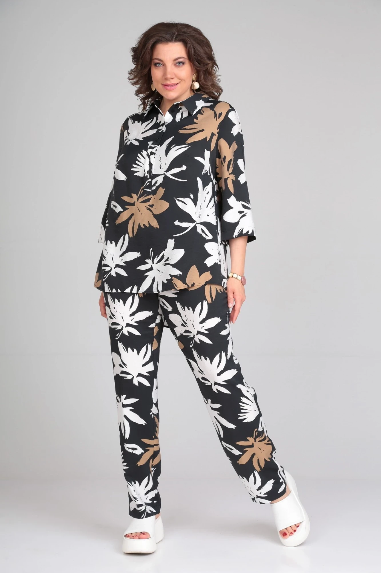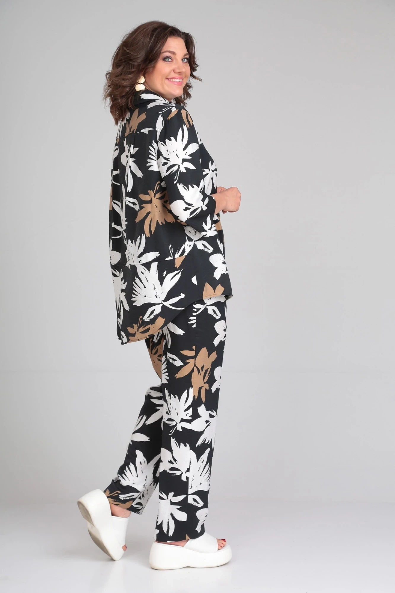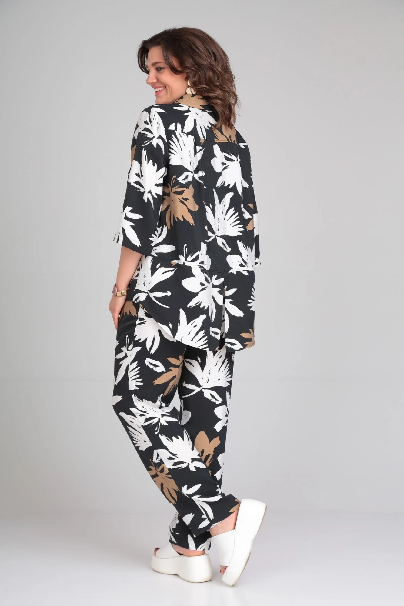 Блуза свободного силуэта с модным принтом. По переду центральная застежка на петли-пуговицы. По спинке отрезная кокетка, от которой заложена складка для свободы движения. В нижней части спинки горизонтальный подрез с разрезом по середине. Низ блузы фигурной формы. Горловина оформлена рубашечным воротником со стойкой. Рукав втачной, одношовный, длиной ¾.