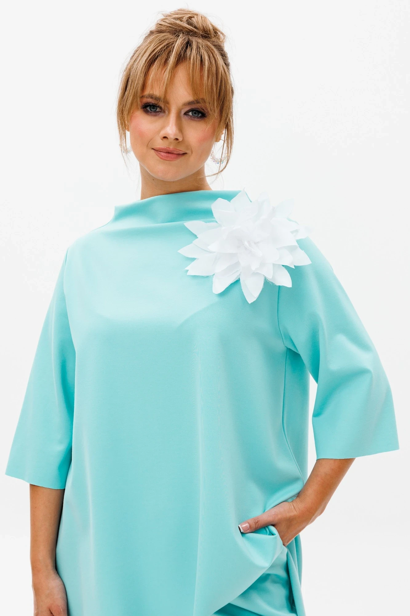 48,50,52, 54 , 56 , 58Блузон А-образного силуэта с ассиметричным низом. Перед цельный. Спинка со средним швом. Горловина оформлена цельновыкроенной стойкой. Рукав втачной, одношовный.