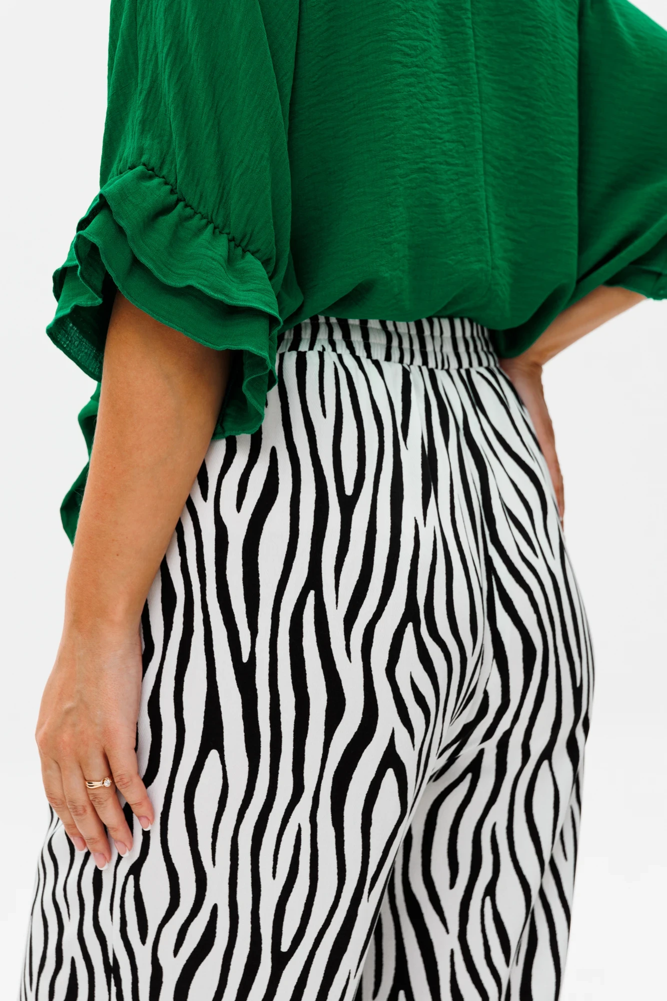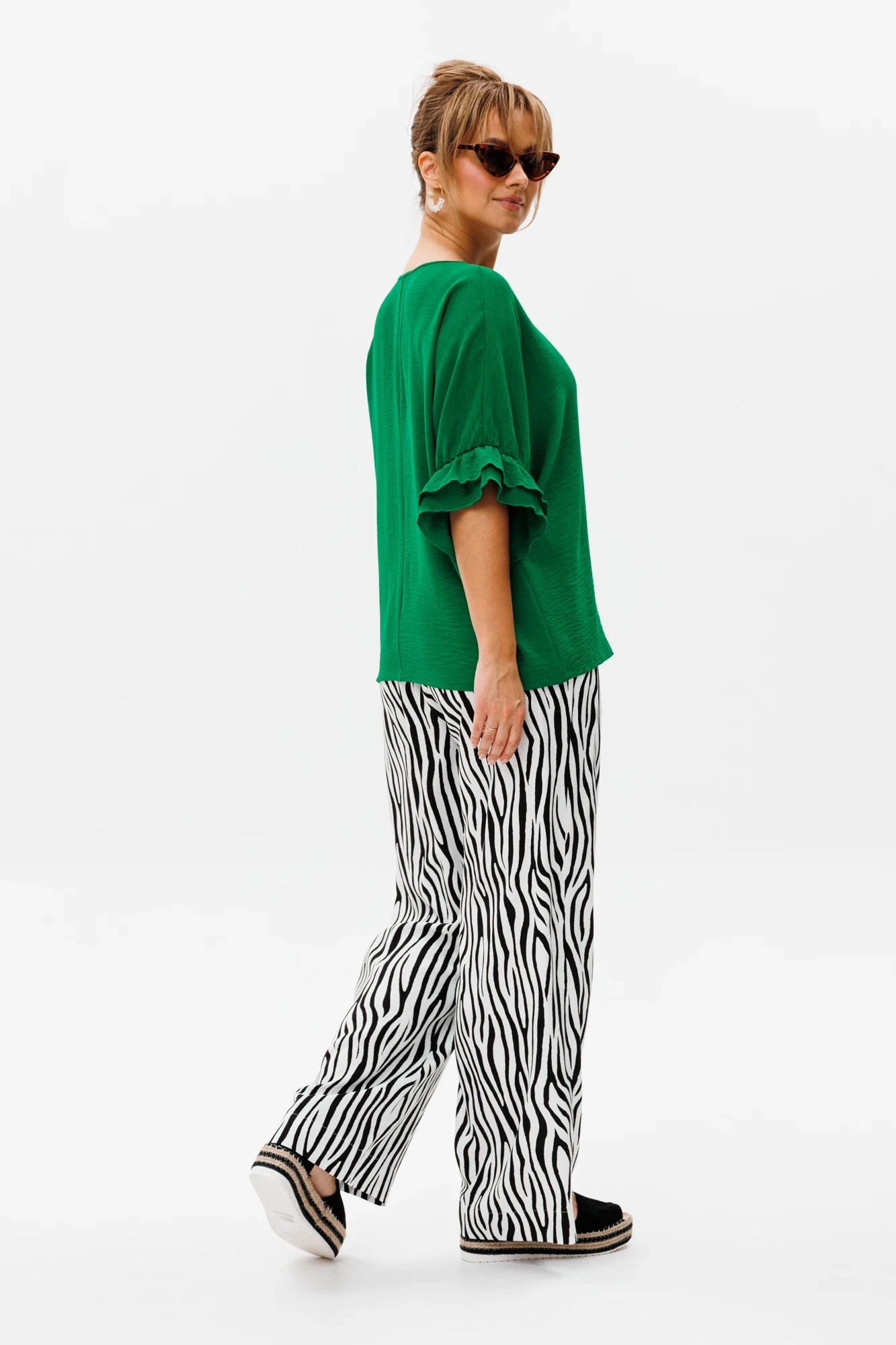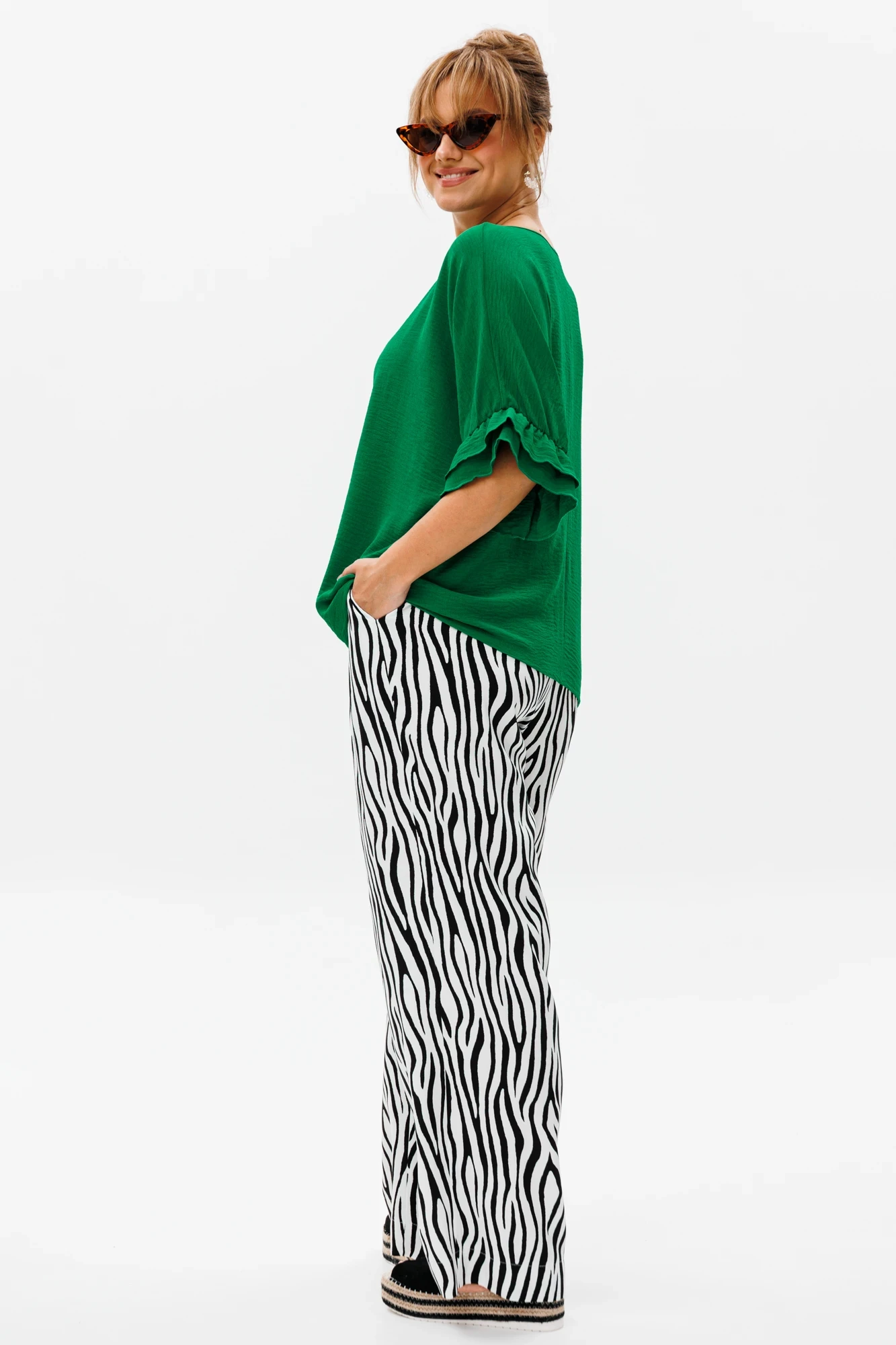 Брюки свободного прямого кроя с высокой посадкой, выполненные из легкой костюмной ткани (не тянется).В боковых швах наклонные карманы. Верхний срез оформлен поясом с эластичной резинкой.