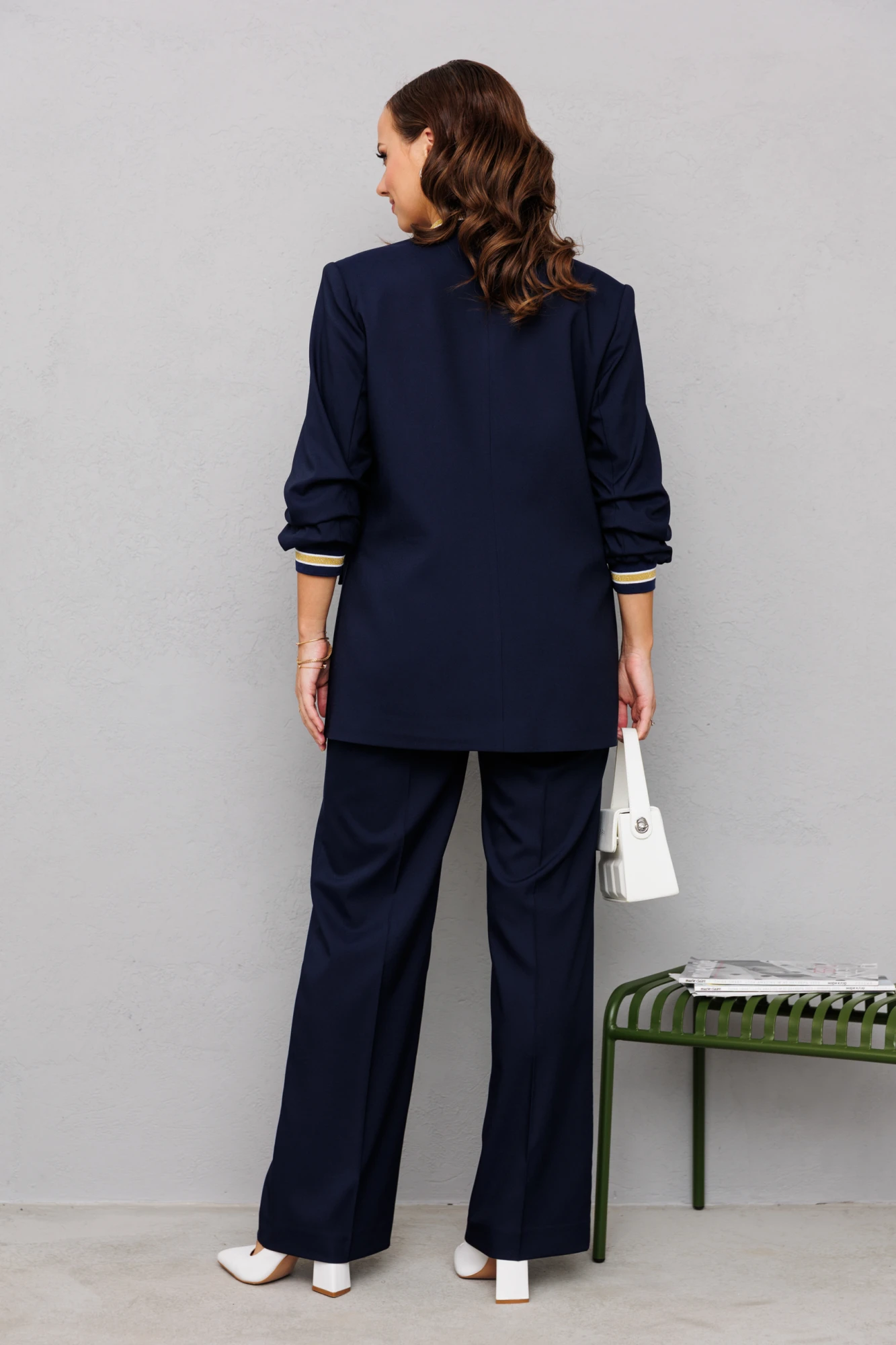 Брюки свободного прямого кроя с высокой посадкой из костюмной ткани (тянется). В боковых швах функциональные карманы. По срезу банта – застежка-молния. Верхний срез оформлен поясом с эластичной резинкой по задней половинке.