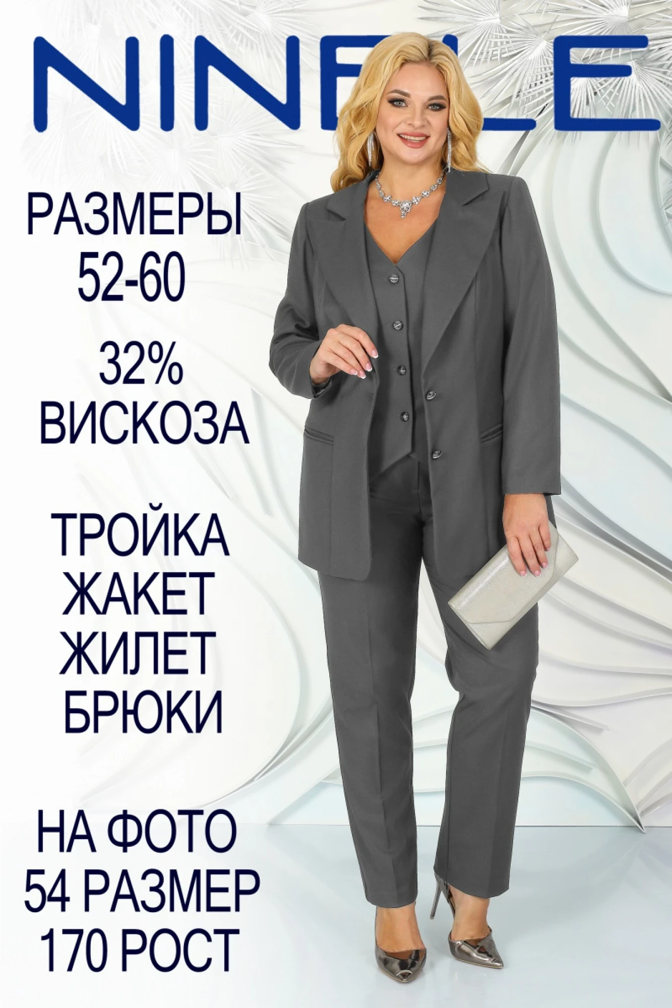 Жакет полуприлегающего силуэта, с центральной бортовой застежкой на 2 петли и 2 пуговицы, с воротником пиджачного типа, с цельнокроеными лацканами. Длина изделия по среднему шву спинки 73,0 см. Перед с вертикальными рельефами от плечевого шва до низа, проходящими через центр груди, с горизонтальными прорезными карманами в рамку, расположенными на боковых частях, ниже линии, в верхней части левой половины переда обработана листочка, с наклонными, втачными концами. Спинка со средним швом, с вертикальными рельефами из плечевого шва до низа, в низу среднего шва спины обработана обтачная шлица. Рукава втачные, двушовные, длиной 61 см. Изделие на подкладке, с плечевыми накладками.