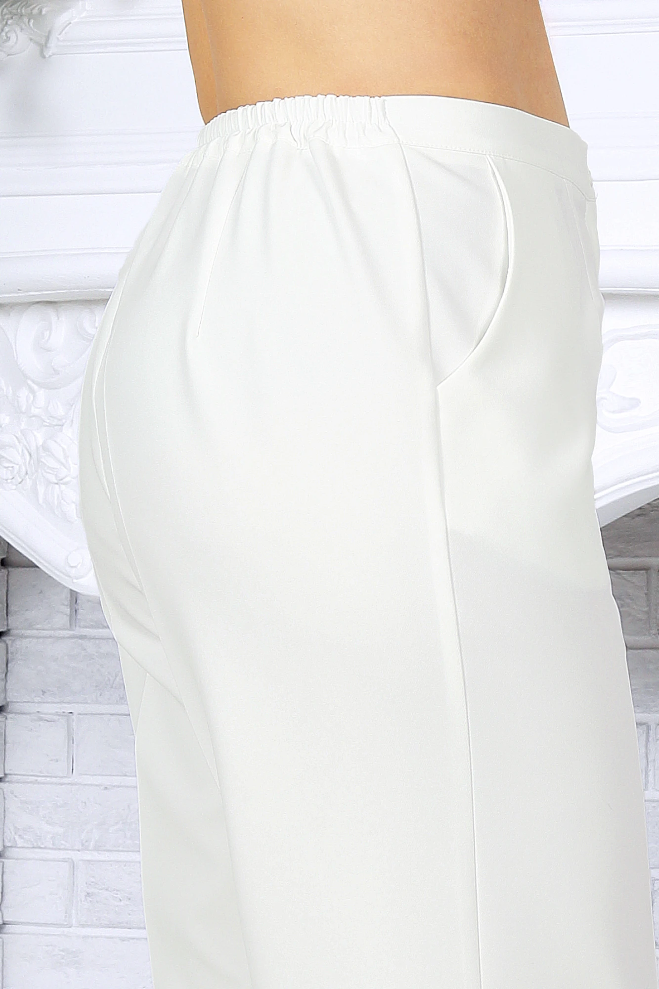 Брюки классические, длинные, с посадкой на талии, выполнены из костюмно- плательной ткани. Модель со стрелками. Передние и задние половинки брюк с талиевыми вытачками, направленными от пояса вниз. Спереди обработаны наклонные боковые карманы и центральная застёжка на тесьму-«молнию». Притачной пояс застегивается на 1 петлю и 1 пуговицу; для лучшего прилегания по линии талии в притачном поясе предусмотрена эластичная лента, вставленная по спинке. Длина брюк по боковому (с поясом) – 106 см.