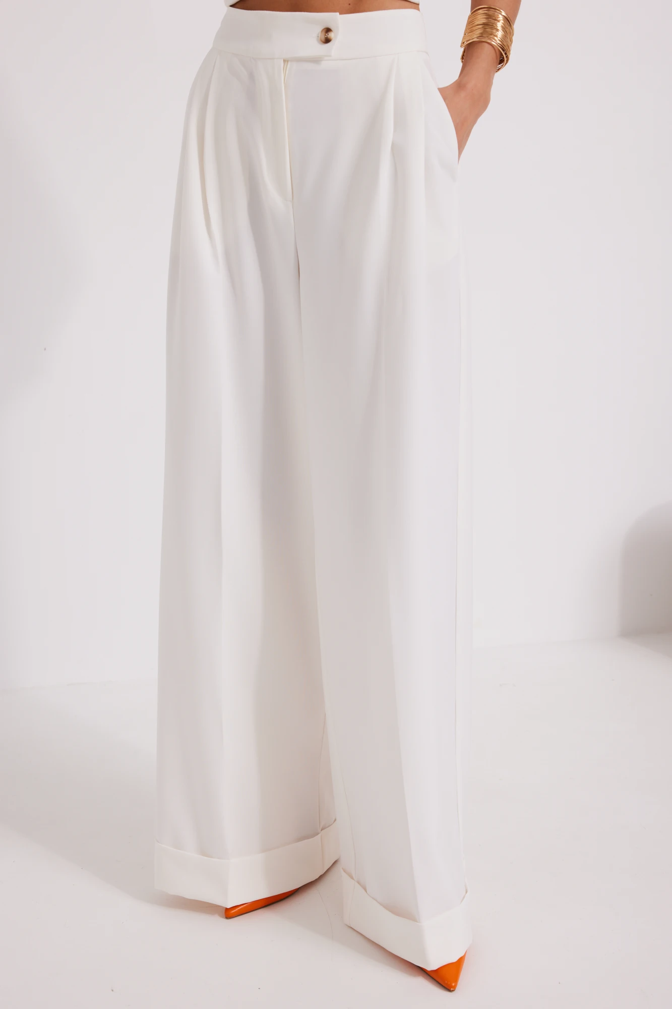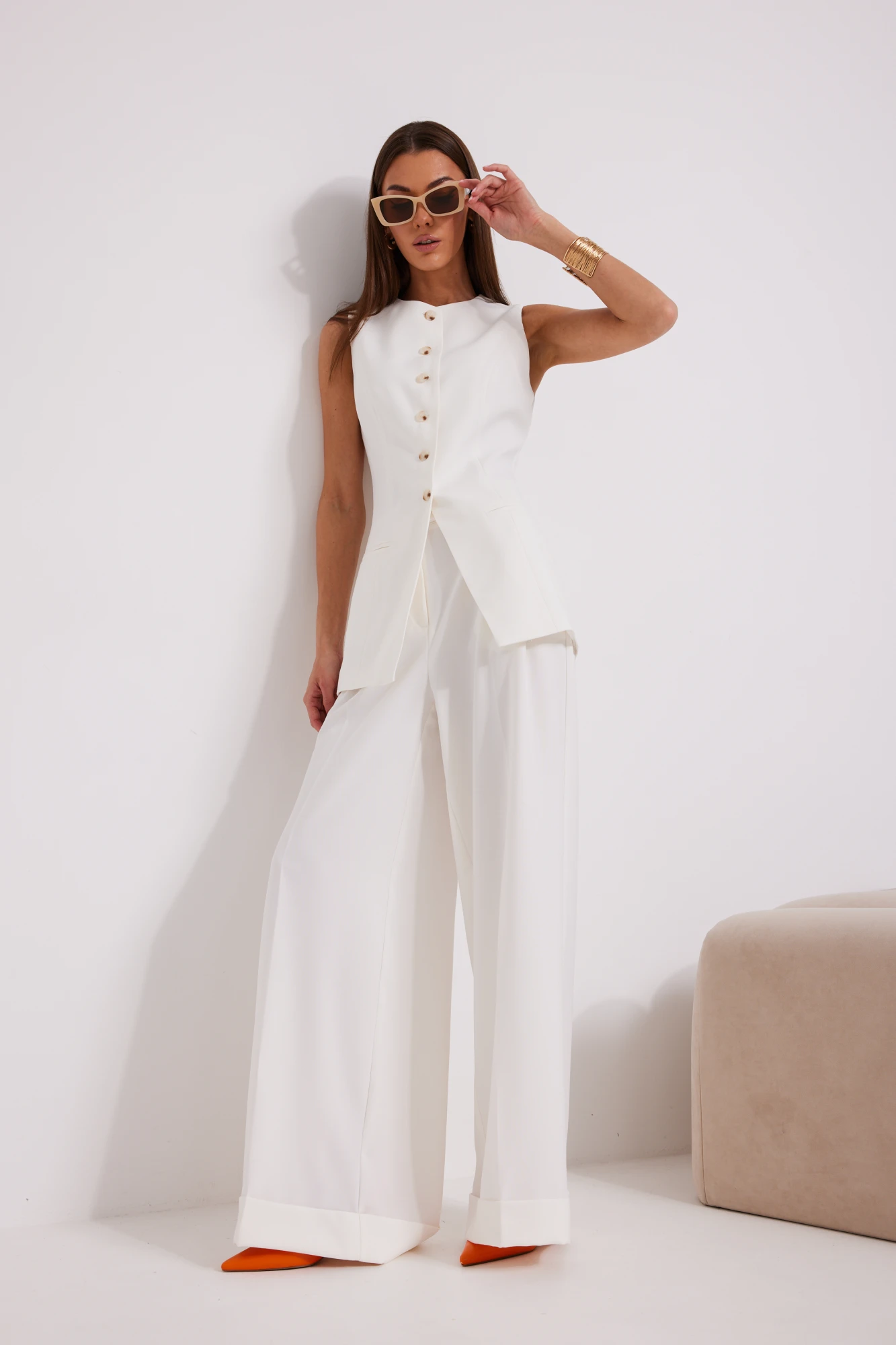 Брюки свободной формы с манжетами, слегка расширены книзу. Верхний срез оформлен цельнокроеным поясом на резинке. В боковых швах передних половинках расположены наклонные карманы. В брюках заутюжены стрелки. На передних половинках расположены складки, направленные к боковому шву, на задней правой половинке расположена «имитация» кармана в рамку с пуговицей, а так же талиевые вытачки. На передних половинках застежка на гульфик.