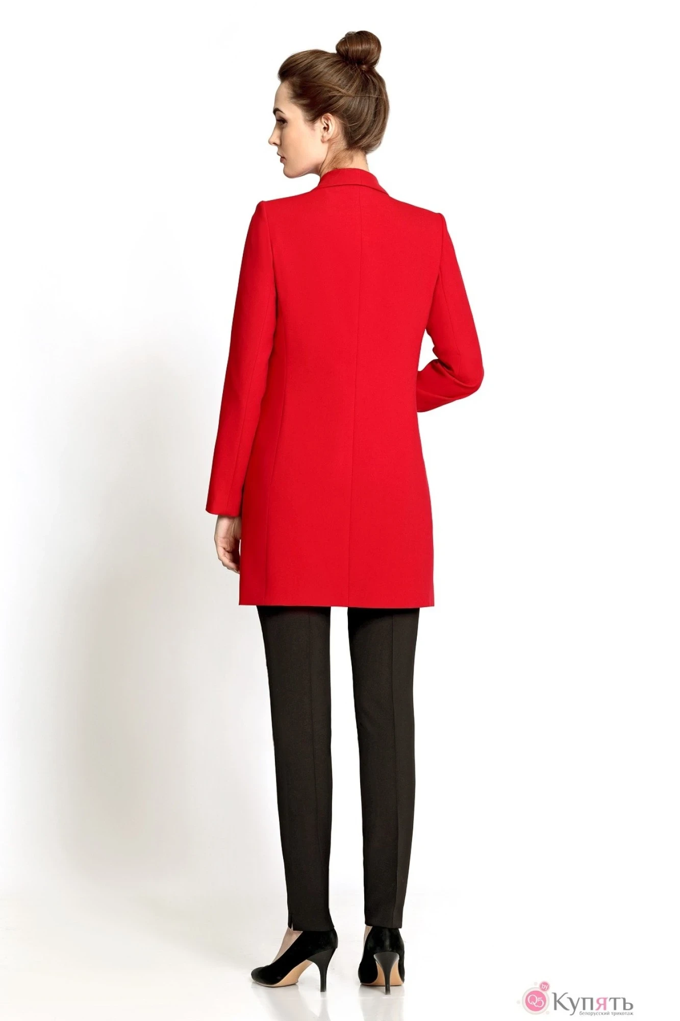 Комплект из удлиненного жакета на подкладке со съемным поясом и плотно облегающих брюк. Детали: жакет из текстильной ткани без застежки, шалевый воротник, перед с прорезными карманами, рукава втачные; брюки без пояса с высокой посадкой, на передних и задних частях брюк застрочены стрелки-защипы, застежка на потайную молнию в левом боковом шве.