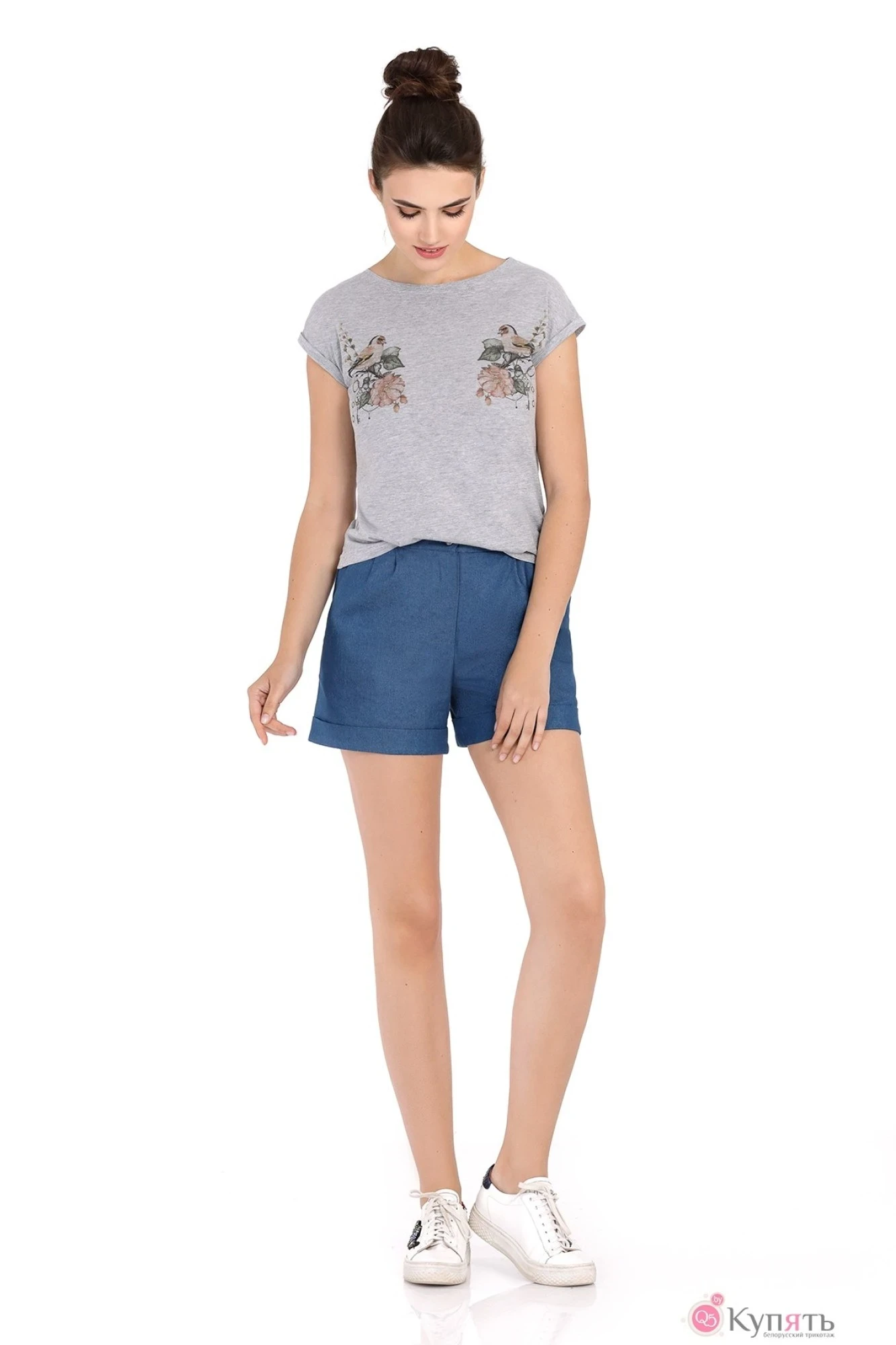 Повседневный комплект-двойка из трикотажной майки с принтом и джинсовых шорт с отворотами. Детали: майка с цельнокроеными рукавами и притачными манжетами, круглый вырез горловины; шорты на притачном поясе с резинкой по задним частям, перед с двумя небольшими складками и боковыми карманами.