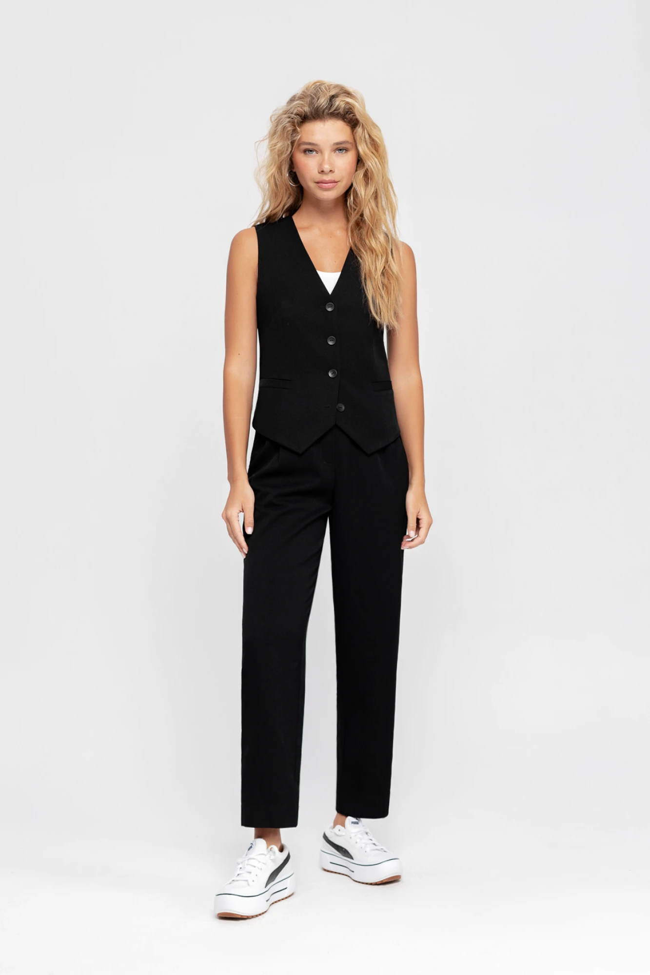 Текстильный костюм-двойка из жилета и брюк со складками Детали: жилет полуприлегающего силуэта с фигурным низом, застежка на петли и пуговицы, на подкладке. Брюки с высокой посадкой, притачной пояс со шлевками, задняя часть пояса эластичная- с резинкой, застежка на молнию и пуговицу, боковые карманы, передние половины с двумя складками Длина жилета по спинке около 48,5 см в размерах 40-46 и около 51,5 см в размерах 48-52; Длина брюк по боковому шву с поясом около 99 см в размерах 40-46 и около 100,5 см в размерах 48-52, длина по внутреннему шву около 69,5 см