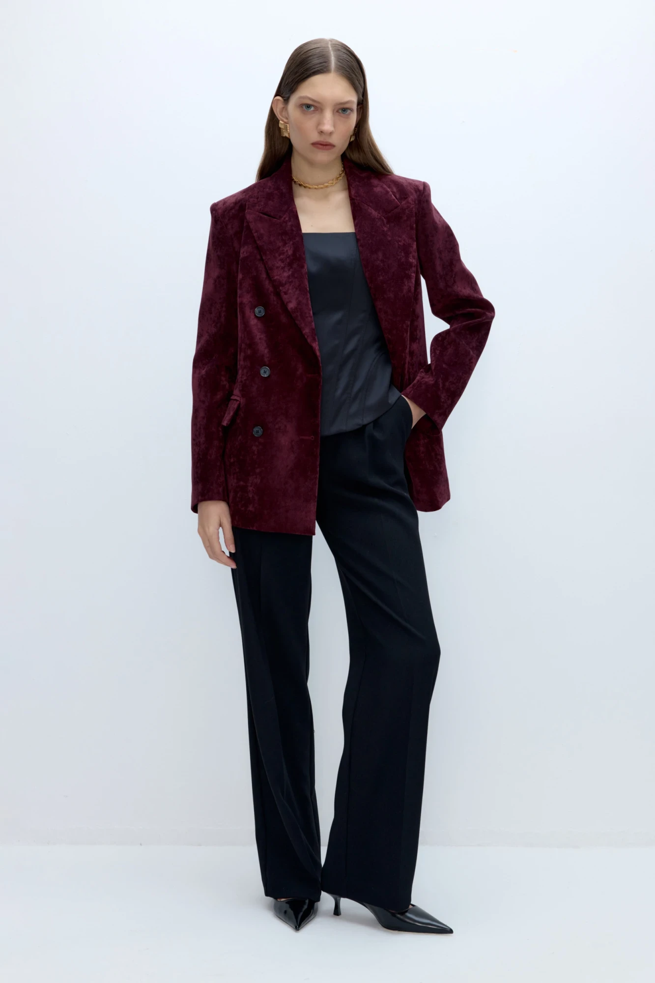 Детали: жакет свободного покроя и полуприлегающего силуэта, двубортная застежка на петли и пуговицы, отрезные бочки, пиджачный воротник, функциональные карманы, жакет на подкладке. Брюки с высокой посадкой, притачной пояс со шлевками, передние половины с небольшими застроченными мягкими складками и заутюженными стрелками, застежка на молнию и пуговицу, боковые карманы. Задние части брюк с вытачками и заутюженными стрелками. Пояс брюк прямой, без резинки.