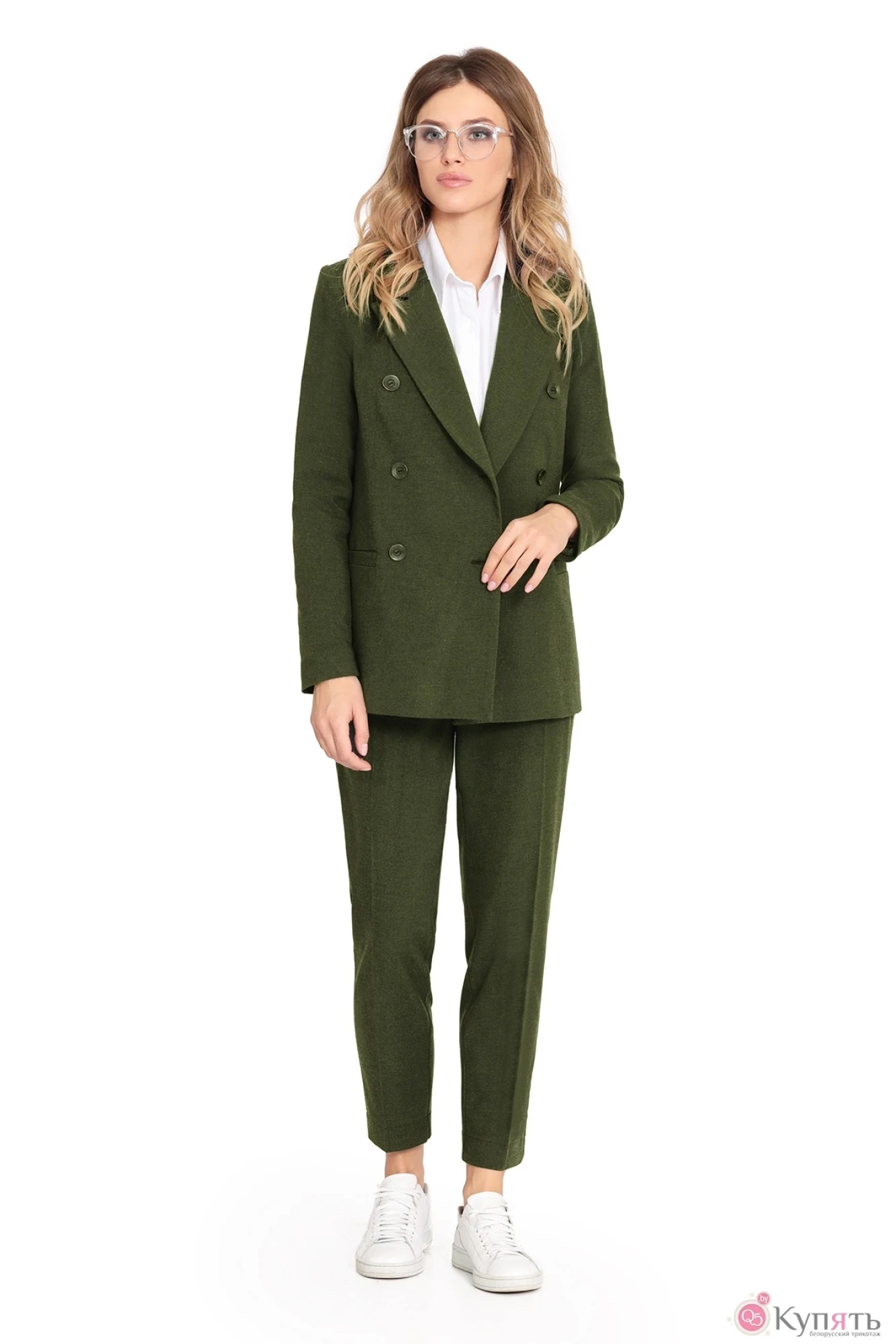 Текстильный костюм-двойка из двубортного блейзера «мужского» покроя и укороченных брюк со стрелками. Детали: прямой силуэт, пиджачный воротник, прорезные карманы, спинка со средним швом, втачные двухшовные рукава; брюки со средней посадкой, застежка на молнию и пуговицу, боковые карманы, передние половины с заутюженными стрелками и двумя небольшими складками.