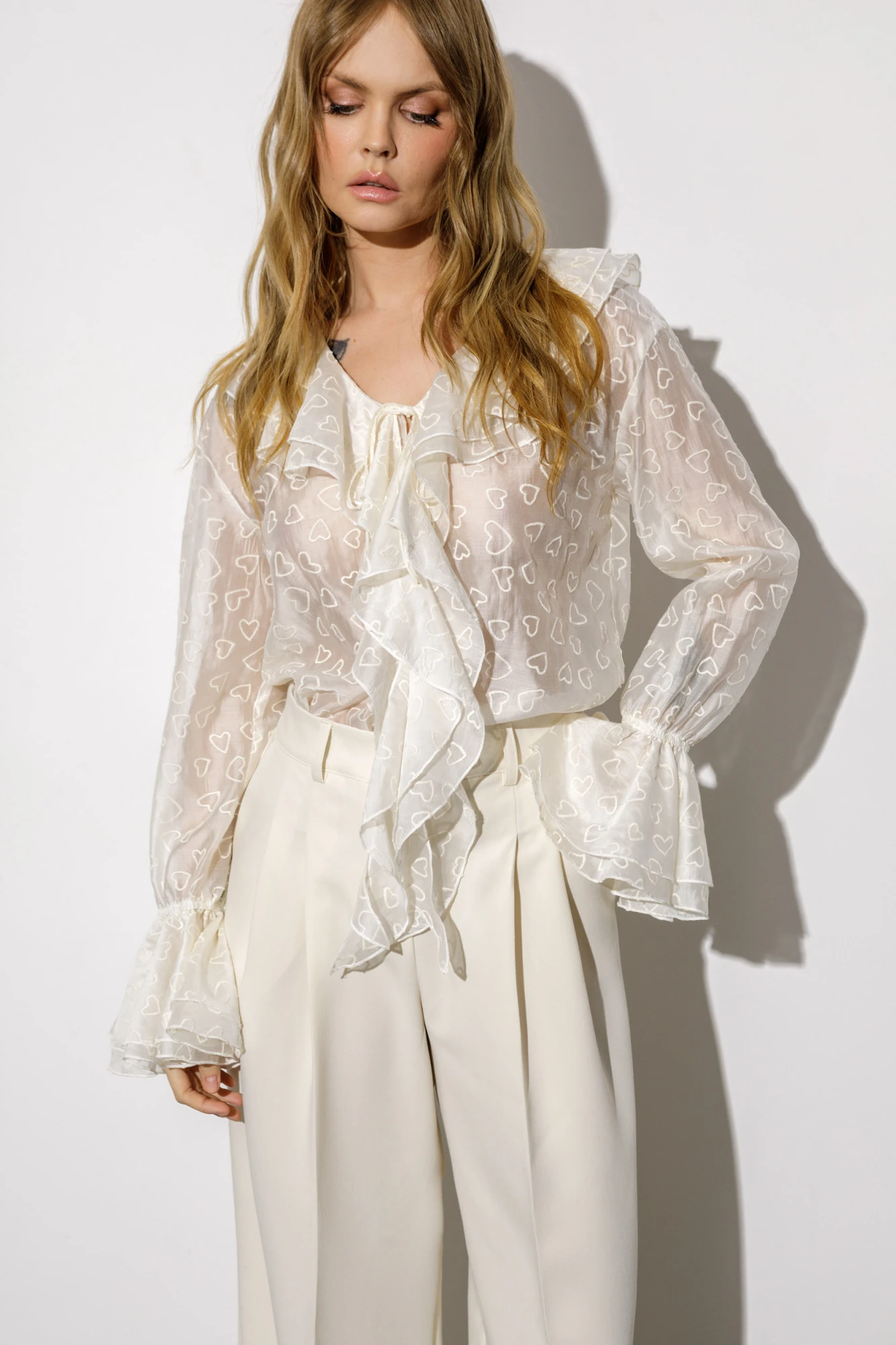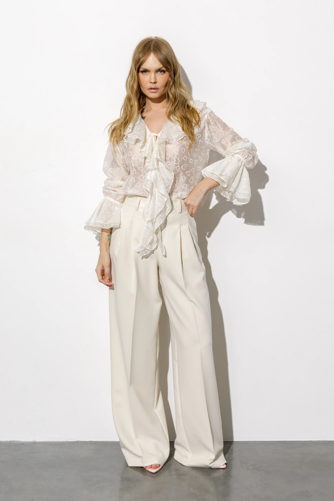 Детали: блуза прямого силуэта, V-образный вырез горловины, воротник-волан, низ рукавов на эластичной тесьме с воланами, завязки по переду. Брюки с притачным поясом со шлевками, складки у пояса, застежка на молнию и пуговицу, боковые карманы, заутюженные стрелки. Задние части брюк с вытачками и имитацией карманов.