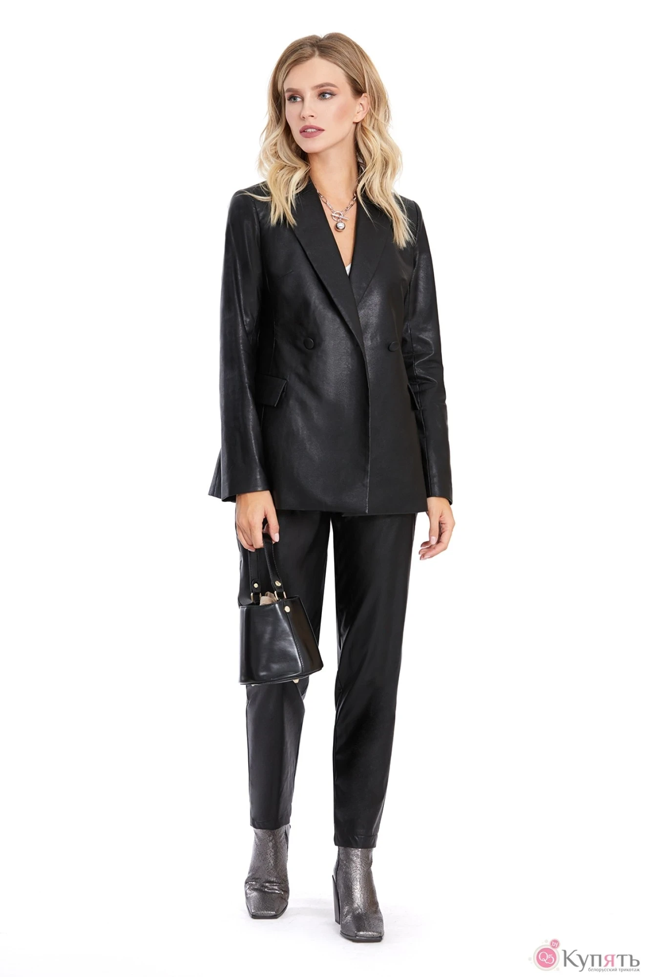 Костюм-двойка из двубортного приталенного жакета и укороченных брюк из искусственной кожи. Детали: полуприлегающий силуэт, пиджачный воротник, перед с отрезными бочками и прорезные карманы с клапанами, застежка на петли и пуговицы, спинка со средним швом и рельефами, рукава втачные двухшовные, жакет на подкладке; брюки со средней посадкой, притачной пояс, передние половины с небольшими мягкими складками, застежка на молнию и пуговицу, боковые карманы.
