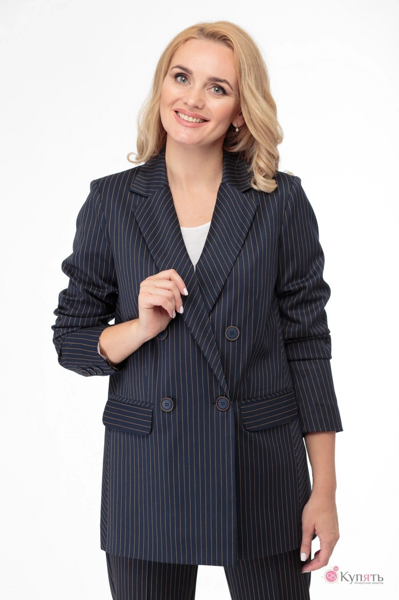 Комплект 2-х предметный состоит из жакета и и брюк. Двубортный жакет, свободного кроя, на подкладке. По переду имеется отрезной бочок и вертикальные вытачки. С прорезными карманами с клапаном и двумя обтачками. Спинка цельная. Воротник пиджачного типа. Рукав двухшовный, по низу рукава обработана шлица на петли-пуговицы. Длина рукава 63 см, длина по спинке 74 см. Классические брюки, прямые, слегка заужены к низу,заутюжены стрелки,по переду обработаны карманы с отрезным бочком,застежка на тесьму-молнию и 1 пуговицу.На задних половинках обработаны вытачки и имитация карманов с листочкой, пояс в брюках притачной. Длина брюк от талии по боковому шву 97 см.