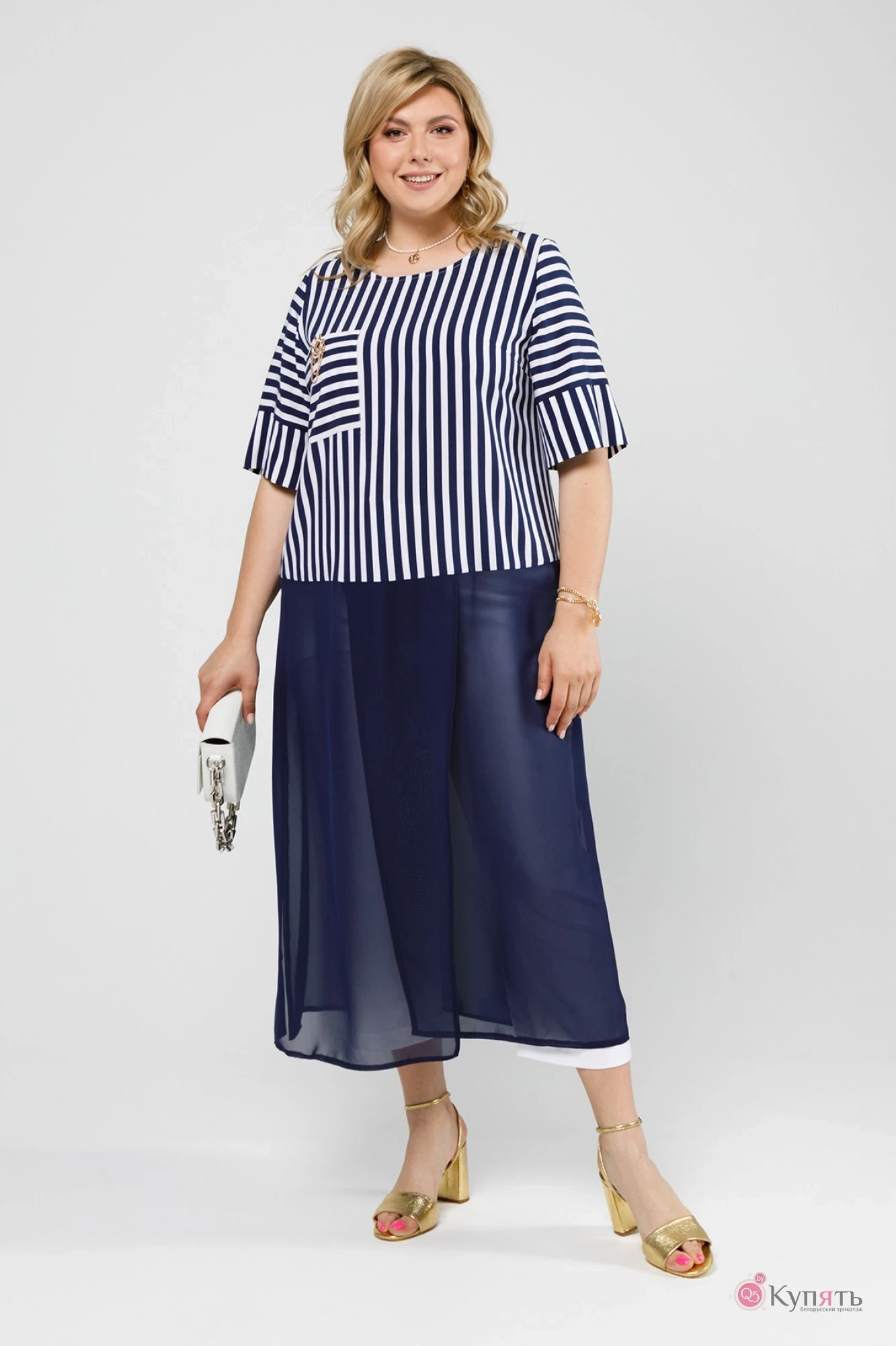 Платье-туника скомбинирована из трикотажной верхней части и шифоновых длинных деталей. На полочке обработаны нагрудные вытачки и нагрудный карман. Рукава втачные одношовные, длиной 33 см. Длина по спинке 129 см.