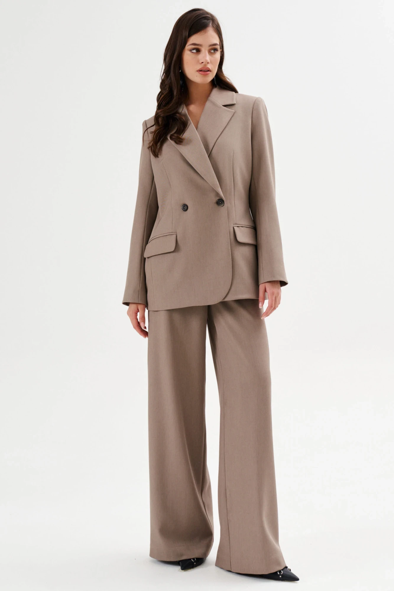 Костюм, состоящий из жакета и брюк. Жакет полуприлегающего силуэта, длиной ниже линии бедер. Спинка с ассиметричным швом и шлицей на которой пришиты пуговицы. Перед с нагрудной вытачкой, рельефом и прорезным карманом «в рамку» с клапаном. Рукава двушовные, втачные, длинные. В локтевом шве шлица с пуговицами. Воротник пиджачного типа с лацканом. Застежка двубортная на петли и пуговицы. Жакет на подкладке. Брюки прямого силуэта, на притачном поясе с резинкой по спинке. По задним половинкам талиевые вытачки. По передним половинкам есть боковые карманы с наклонным входом, с застежкой на тесьму-«молнию» с гульфиком и откоском. По поясу застежка на петлю и пуговицу.