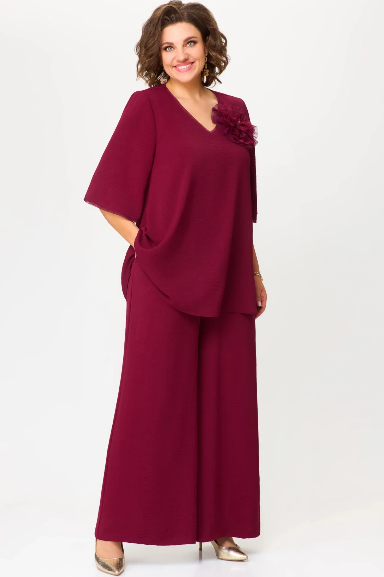 Блузка A – силуэта c втачным рукавом. Горловина v- образной формы. Рукав длиной ¾, с расширением по низу. По горловине и низу рукава бейка из сетки. Украшением служит съемный объемный цветок.