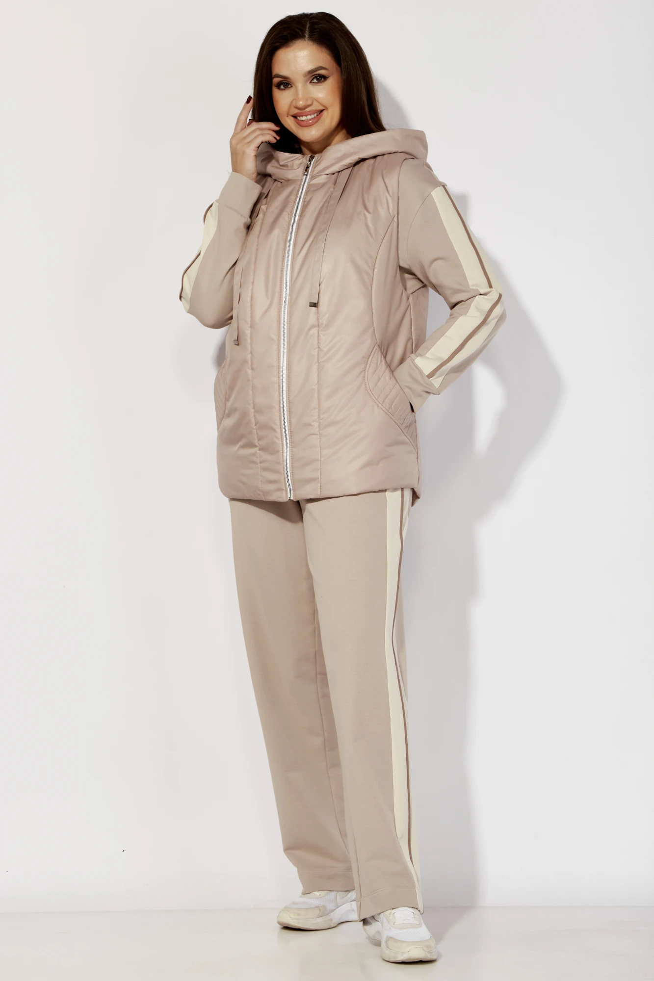 Свитшот прямого силуэта с отрезными бочками. Рукав длинный, со спущенной линией плеча, снизу на манжете. Горловина круглой формы с подрезной бейкой. Перед задекорирован принтом. Брюки прямые с карманами в боковых швах. По низу небольшой разрез. Пояс притачной с резинкой(по центру гладкий)По бокам брюк и по центру рукавов втачные отделочные лампасы с контрастным кантом. Жилет выполнен из плащевки на синтепоне(vs100) на подкладке, прямого силуэта. По переду рельефы из пройм в боковой шов. В рельефах карманы с отделочными деталями в форме клапана. Застежка центральная на тесьму "молния" Горловина оформлена капюшоном со стойкой и кулисой. По спинке фигурные рельефы. Центральная часть с отделочной деталью и декоративной нашивкой. Низ жилета по спинке чуть длиннее.