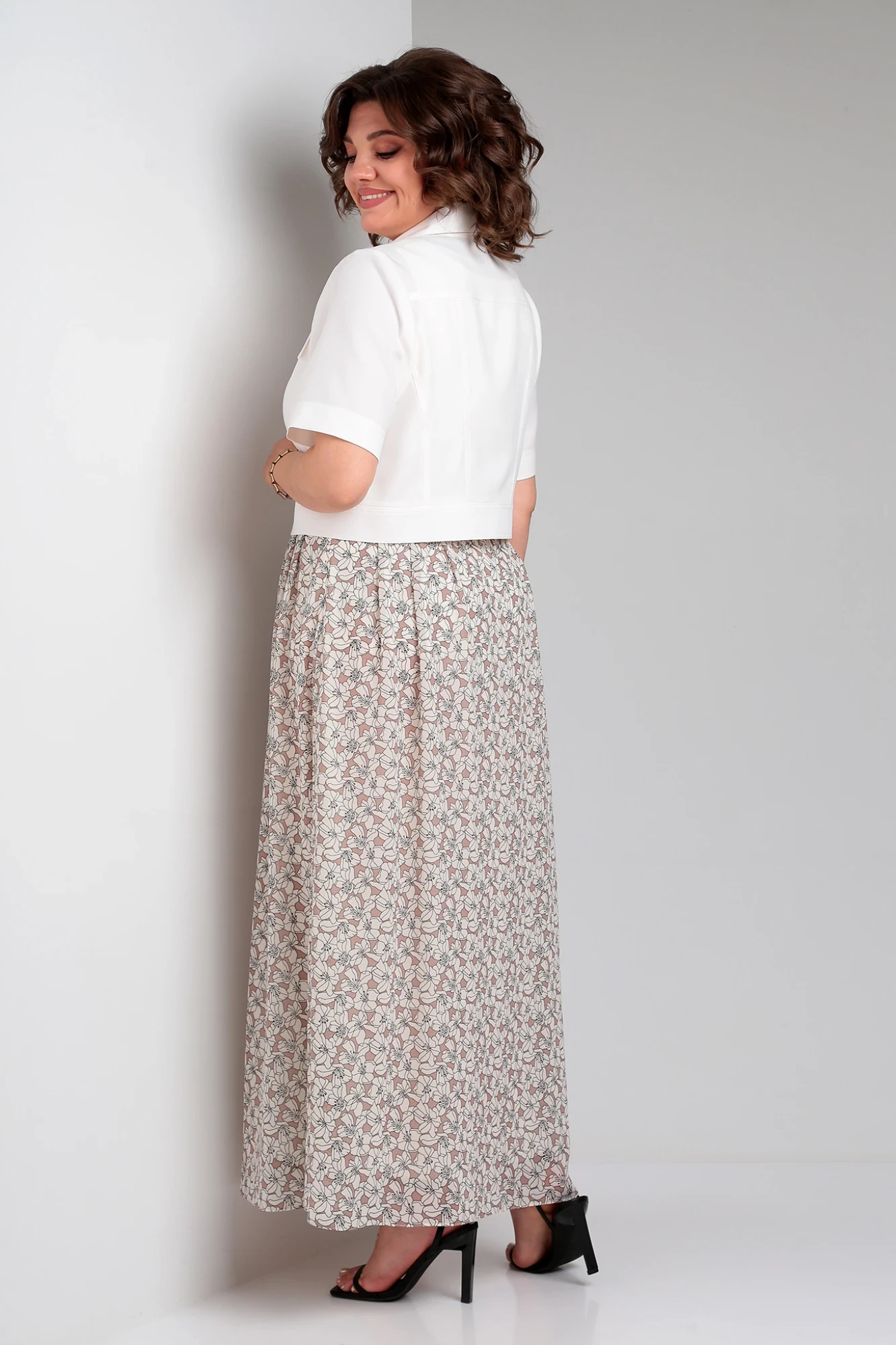 Комплект состоит из платья и укороченного жакета. Платье отрезное по линии талии, выполнено из двух видов ткани. Нижняя часть платья выполнена из шифона на трикотажной подкладке. В боковом шве потайная молния. Жакет длинной чуть ниже линии талии. Воротник стояче отложной, рукав втачной одно-шовный, центральная застёжка на петли и пуговицы. Низ жакета на притачном поясе.
