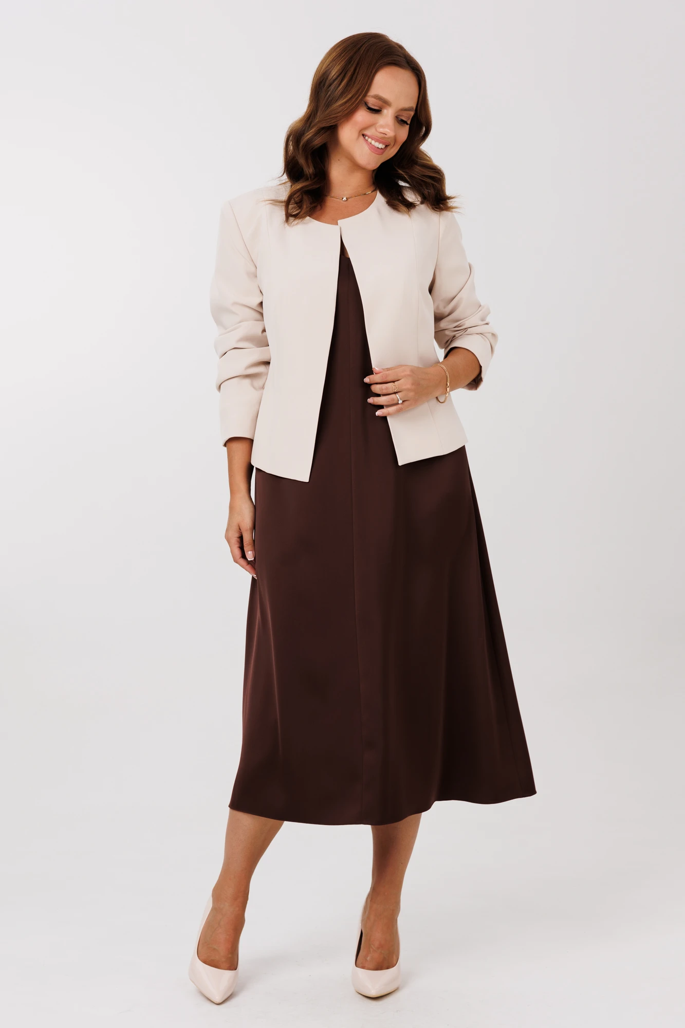Жакет полуприлегающего силуэта, выполнен из костюмной ткани (тянется), на подкладке. По переду рельефные швы, застежка встык, горловина округлой формы. По спинке средний шов и талиевые вытачки. Рукава втачные, двухшовные. Жакет с плечевыми накладками.