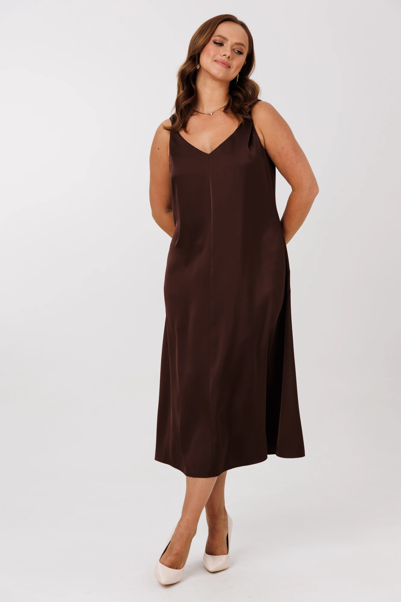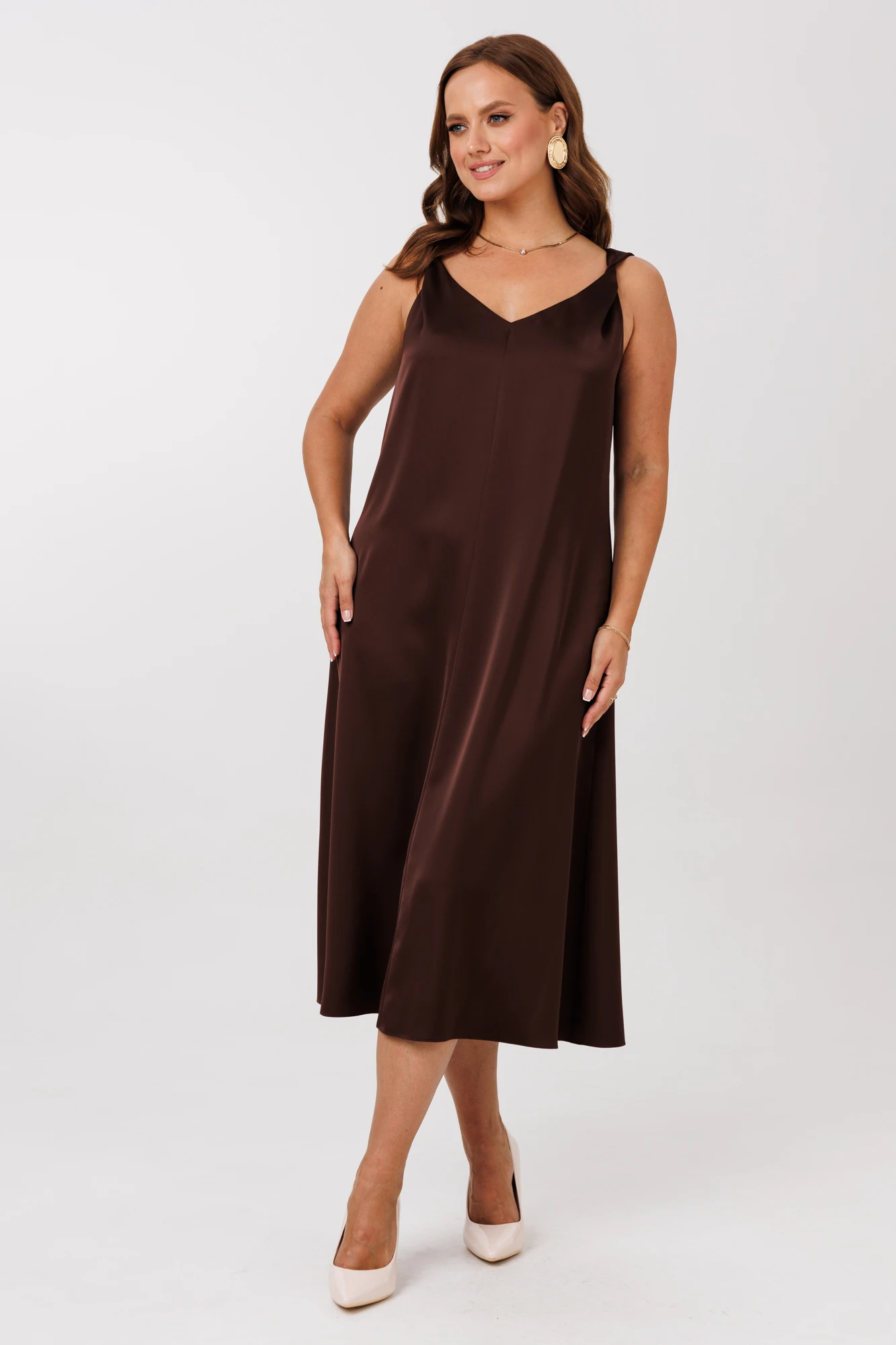 Платье А-силуэта без рукавов, выполненное из струящего шелка «Армани» (тянется). По переду и спинке центральные вертикальные швы. Горловина оформлена V-образным вырезом с акцентом на верхней части – декоративным перекрутом в области бретелей. Мягкая драпировка добавляет образу мягкости, романтичности и элегантности. Верхняя часть лифа на обтачке до линии талии.