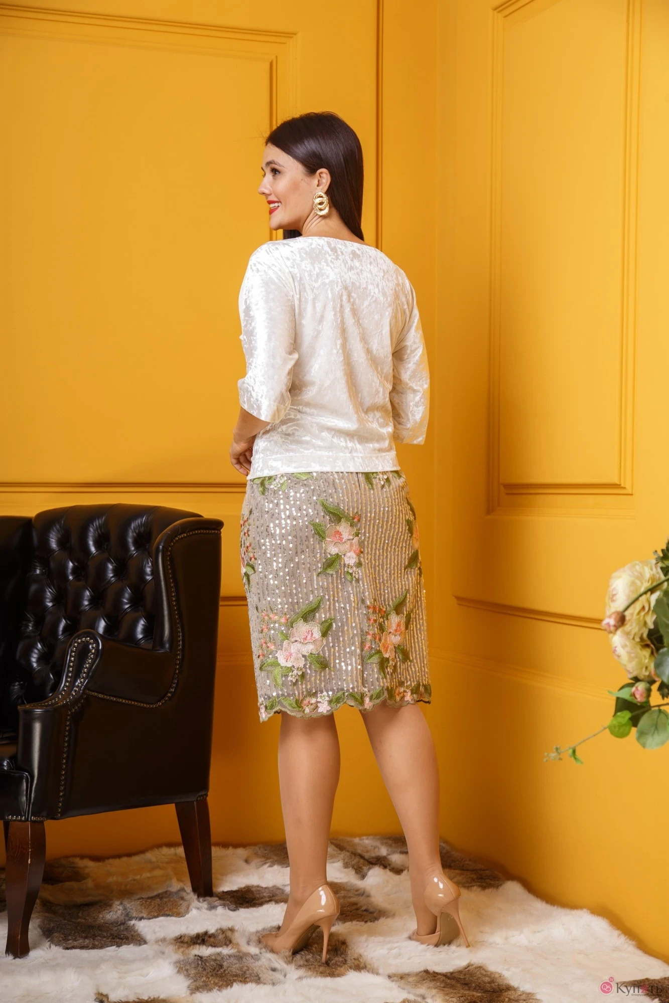 Комплект женский 2-х предметный: блуза,юбка. Блуза из трикотажного полотна " велюр",молочного цвета,прямого силуэта. Полочка и спинка-цельные. Рукав- цельнокроеный, длиной 3/4. Горловина- в форме " лодочки. Юбка двухшовная,зауженная к низу, из органзы с пайетками и вышитыми цветами. Нижняя юбка из текстильной ткани-однотон-олива. На переднем и заднем полотнище-талиевые вытачки. На заднем полотнище-средний шов, с застежкой на потайную молнию. Верхний срез юбки обметан и прострочена отделочная строчка 3,5 см. Низ верхней юбки фигурный,с вышивкой по краю.