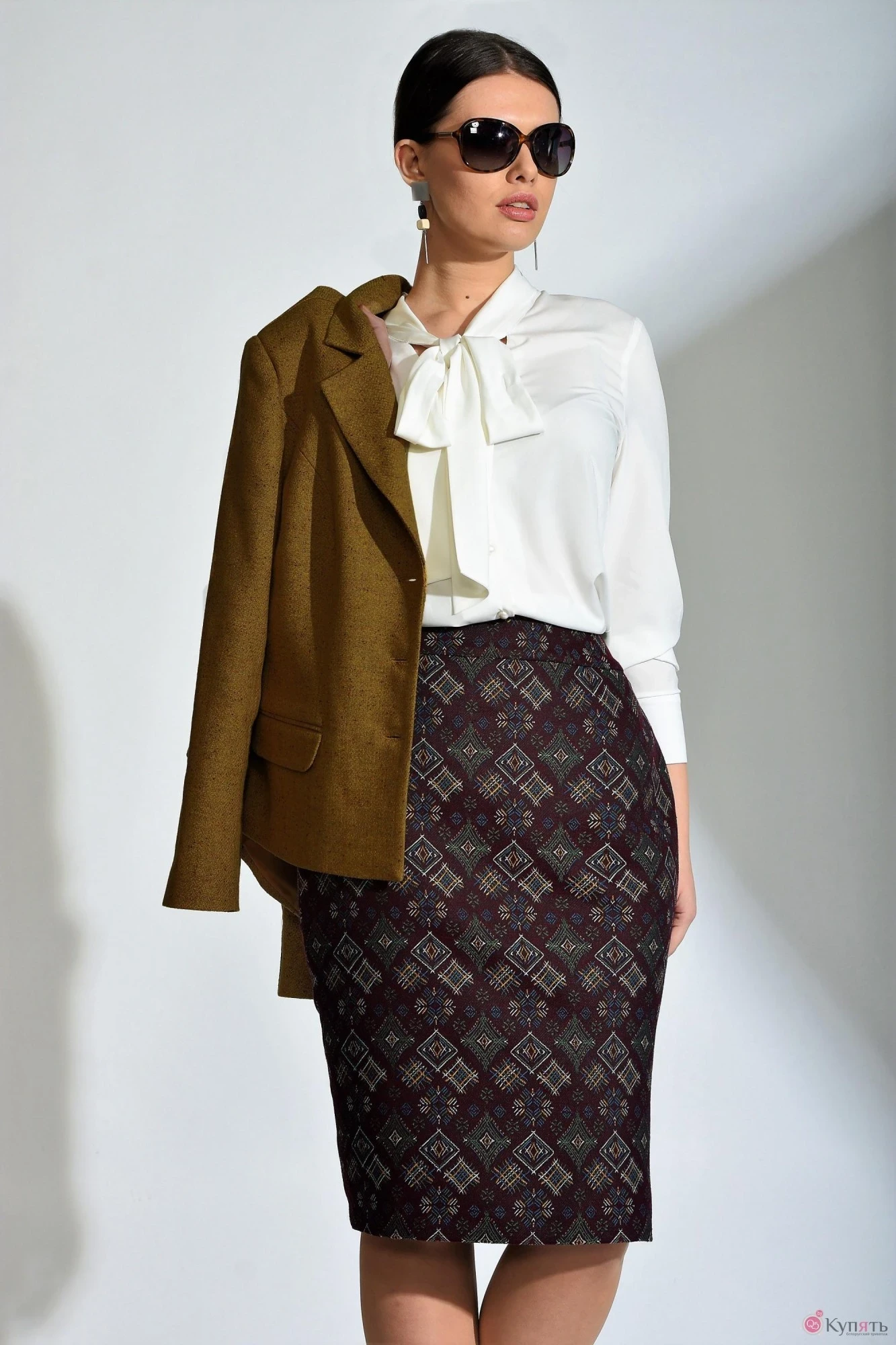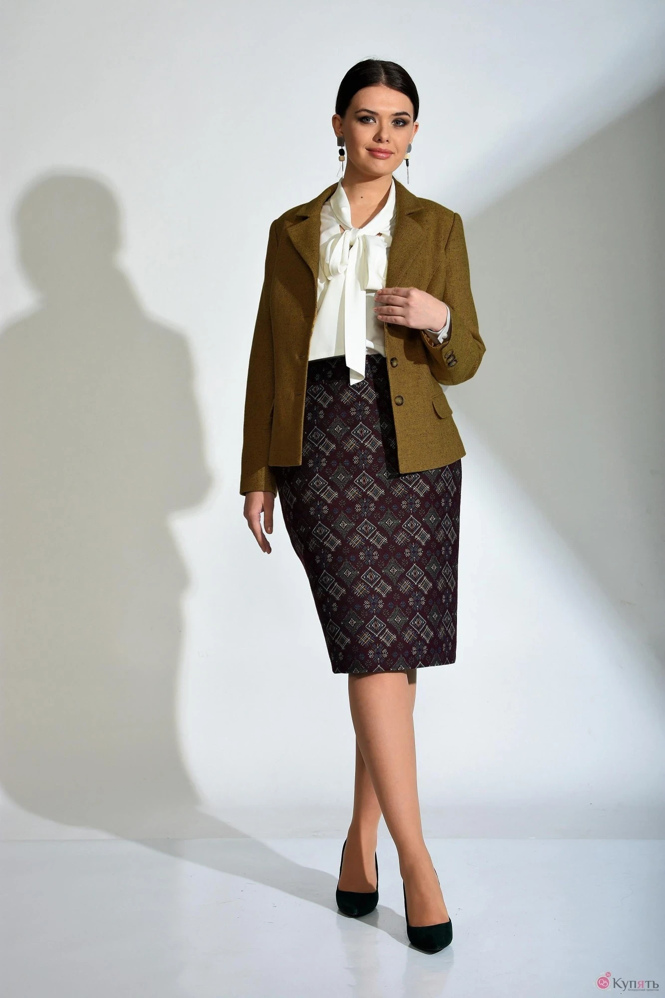 Категория: Костюм жакет и юбка. Стильный костюм создаст неповторимый образ. Однобортный жакет, горчичного цвета с карманами.Теплый, мягкий сделан из ткани на ослове шерсти. Юбка карандаш из ткани гобелён с вытканным узором.Жакет шерсть . сезон: мультисезон.