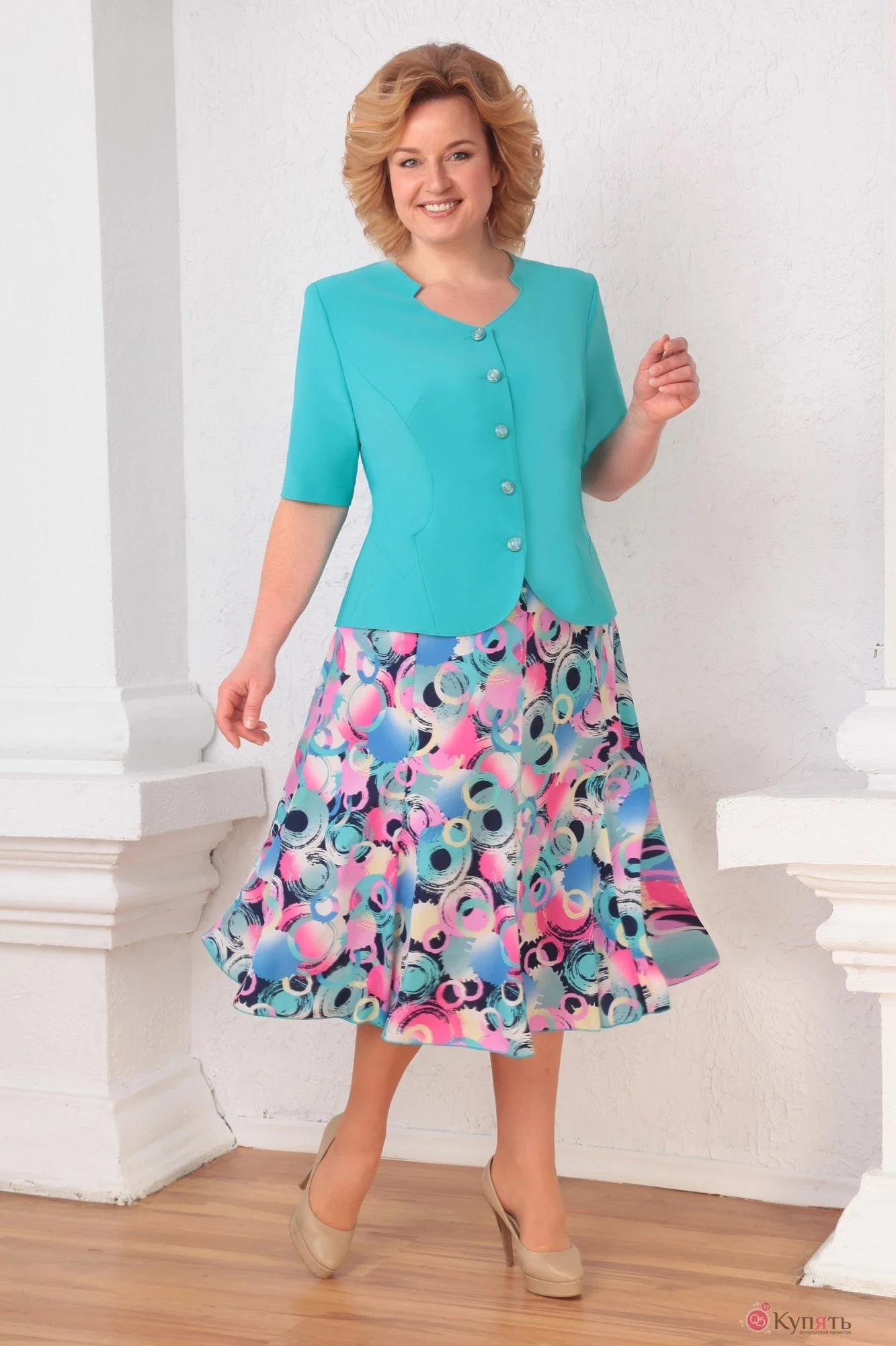 Костюм женский, двухпредметный, состоящий из жакета и юбки. Жакет полуприлегающего силуэта, из костюмной стрейчевой ткани. Юбка расширена к низу, из стрейчевой непрозрачной шифоновой ткани. Рукав короткий. Горловина фигурная. По переду центральная застёжка на 5 пуговиц и петель. Фигурный рельеф из проймы до низа, с нагрудной вытачкой. По линии бёдер фигурный подрез. Борта по низу закруглены. Спинка с центральным швом и рельефами из проймы до низа. Юбка - восьмиклинка на поясе, резинка по бокам, застёжка сзади на молнию, по поясу на петлю и пуговицу.