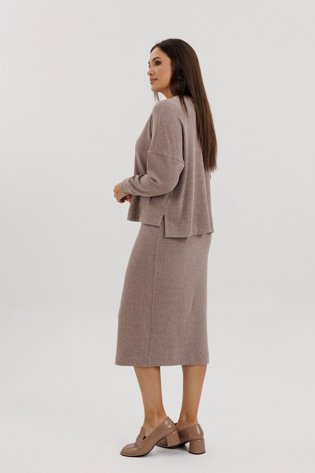 Мягкое, уютное трикотажное полотно в рубчик, платье полуприлегающего силуэта, с V-образным вырезом горловины, без рукава.