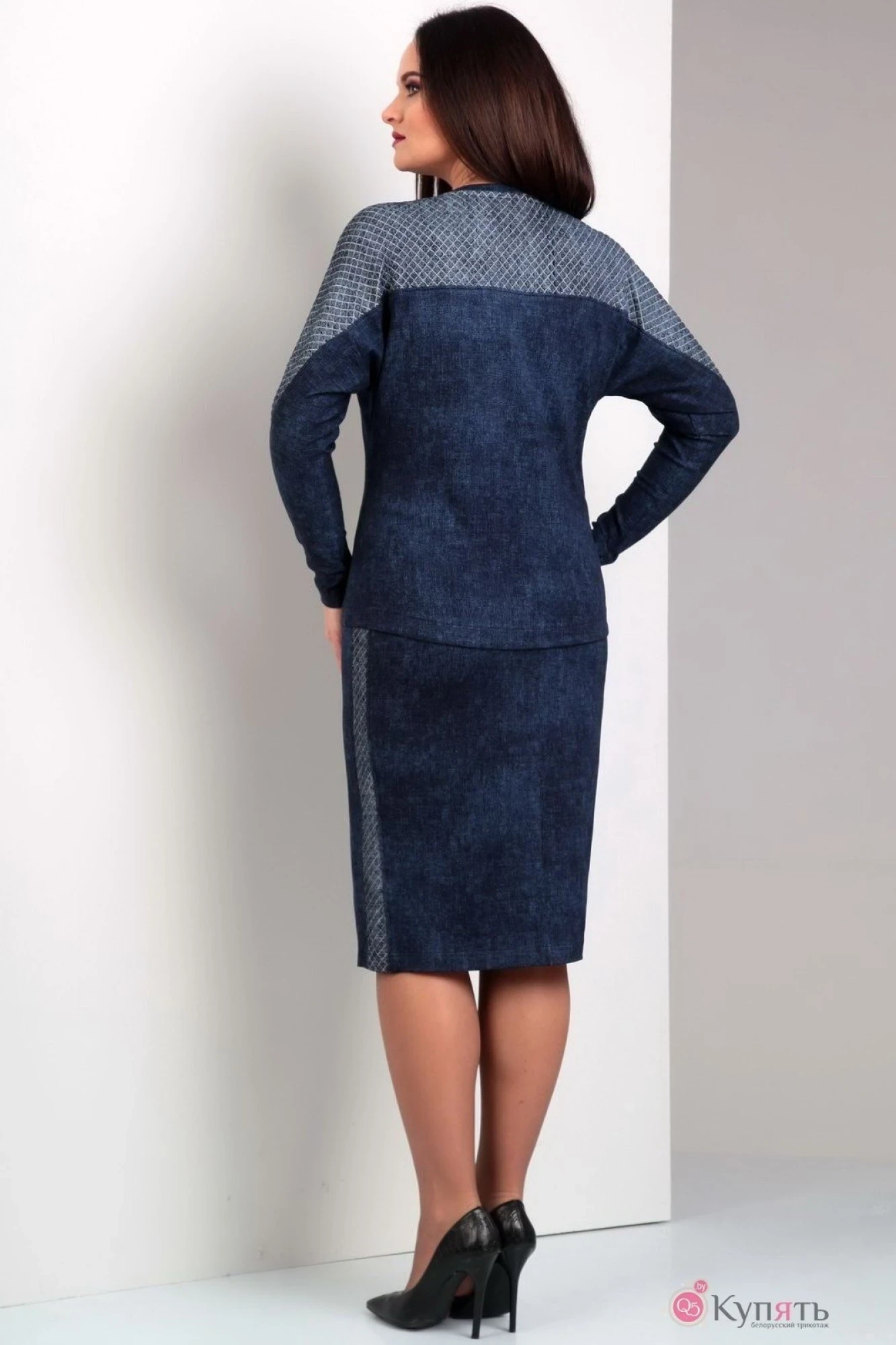Комплект женский, юбочный из трикотажного полотна. Блузка свободного силуэта с цельно-кроенным рукавом. Кокетка полочки и спинки выполнены из отделочной ткани. На полочке обработан нагрудный карман. Юбка зауженная, с отделочными деталями по бокам. Застежка на потайную молнию в среднем шве.