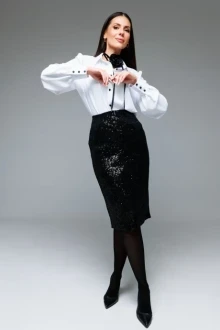 50Юбка на подкладке прямого силуэта, чуть зауженная к низу. В среднем шве размещена потайная молния и открытый разрез. На линии талии размещены классические вытачки. Пояс внутренний, обтачной. Длина юбки по боковому шву 70 см. Высота разреза 21 см.