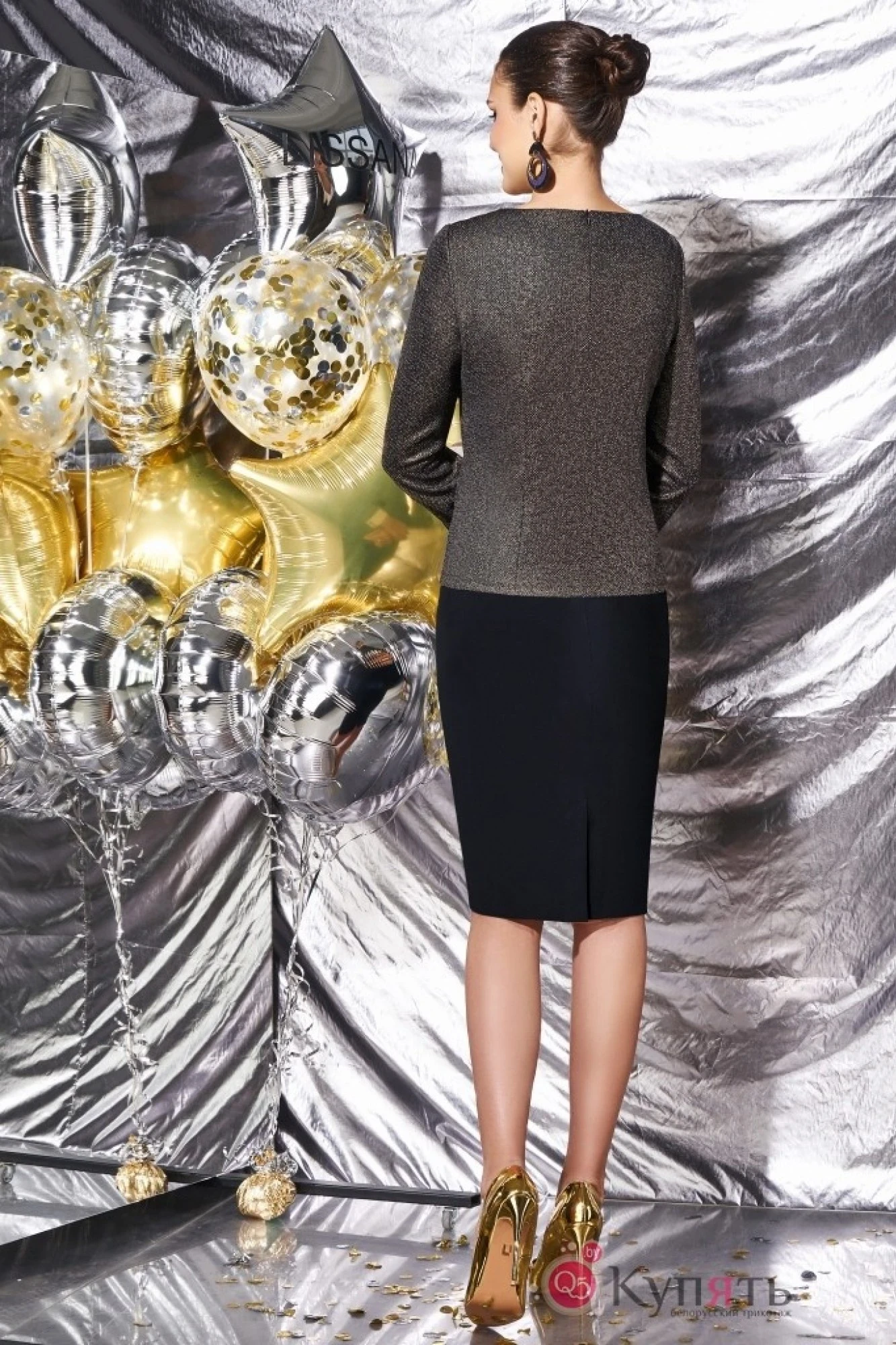 Костюм юбочный Комплектация: блузон, юбка Блузон с округлым вырезом горловины. Перед с отрезной деталью по горловине и декоративной съемной брошью. Спинка со средним швом, талиевыми вытачками, потайной молнией в среднем шве. Рукава втачные, с манжетами по низу, и застёжкой на петли и пуговицы. Юбка на поясе. Заднее полотнище с потайной молнией и шлицей в среднем шве. Юбка на подкладке. Блузон длиной по спинке –56см. Длина рукава - 62см. Юбка вдоль середины переднего полотнища – 62см.