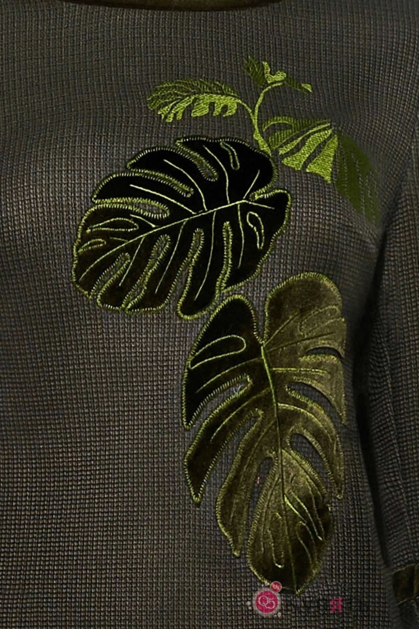 Комплектация: Блузка-свитшот, юбка. Современный комплект в стиле «ROMANTIC CASUAL» отлично впишется в офисный «Dress-Code» и подчеркнет ваш индивидуальный стиль. Комплект выполнен из костюмной ткани в сочетании с отделкой из мягкого бархата. Свитшот полуприлегающего силуэта с узкими отрезными бочками по переду и нагрудными вытачками. Отличительная особенность данной модели дизайнерская вышивка «Монстера», вышивка выполнена в технике аппликации с настроченными бархатными деталями. Низ свитшота и горловина обработаны узкой отрезной бейкой из бархата. Спинка со средним швом и талиевыми вытачками. Застежка на металлическую молнию в среднем шве спинки, молния разъемная. Рукава втачные, свободные с притачным воланом из бархата, волан заложен мягкими складками. Юбка карандаш с отрезным поясом и талиевыми вытачками , застежка на потайную молнию в среднем шве, по низу юбки шлица. ВСЯ ВНУТРЕННЯЯ ОБРАБОТКА ВЫПОЛНЕНА ПО ЕВРОПЕЙСКОЙ ТЕХНОЛОГИИ. ВОЗМОЖНА ЗАМЕНА ФУРНИТУРЫ НА АНАЛОГИЧНУЮ ТАКОГО ЖЕ КАЧЕСТВА.