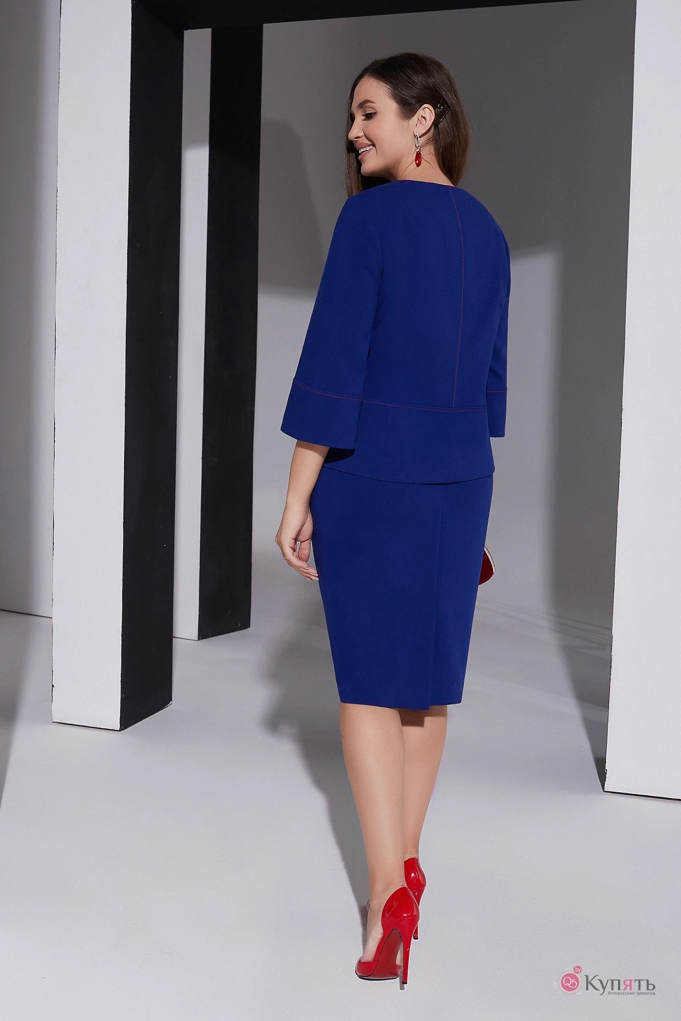 52,54,56Дизайнерский юбочный костюм с контрастной отстрочкой и акцентом на яркую брошь и стильные пуговицы . Жакет А-образного силуэта отрезной ниже уровня талии с центральной застежкой на петли и пуговицы. Перед отрезной чуть ниже талии с настрочными листочками украшен съемной брошью ручной работы. Брошь «Королевская Орхидея» выполнена из итальянских пайеток и страз, расшита бусинами. Спинка со средним швом и талиевыми вытачками отрезная чуть ниже уровня талии. На обтачке спинки жакета выполнена аккуратная вышивка . Рукав колокол на основе втачного, к низу расширен. Юбка карандаш с бочками и отрезным поясом по бокам на резинке, застежка на пуговицу и потайную молнию в среднем шве спинки по низу шлица . Жакет и юбка на подкладке.