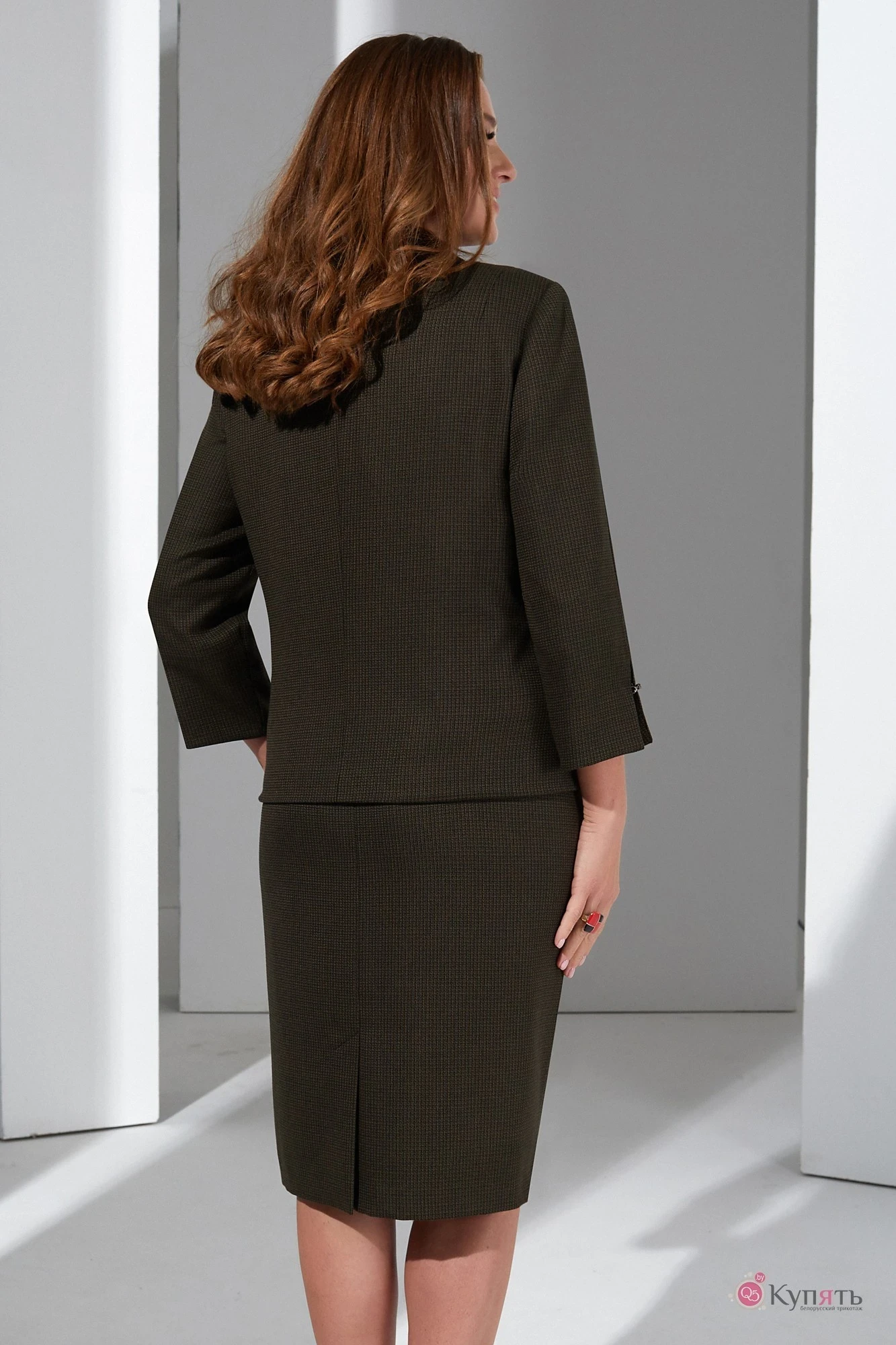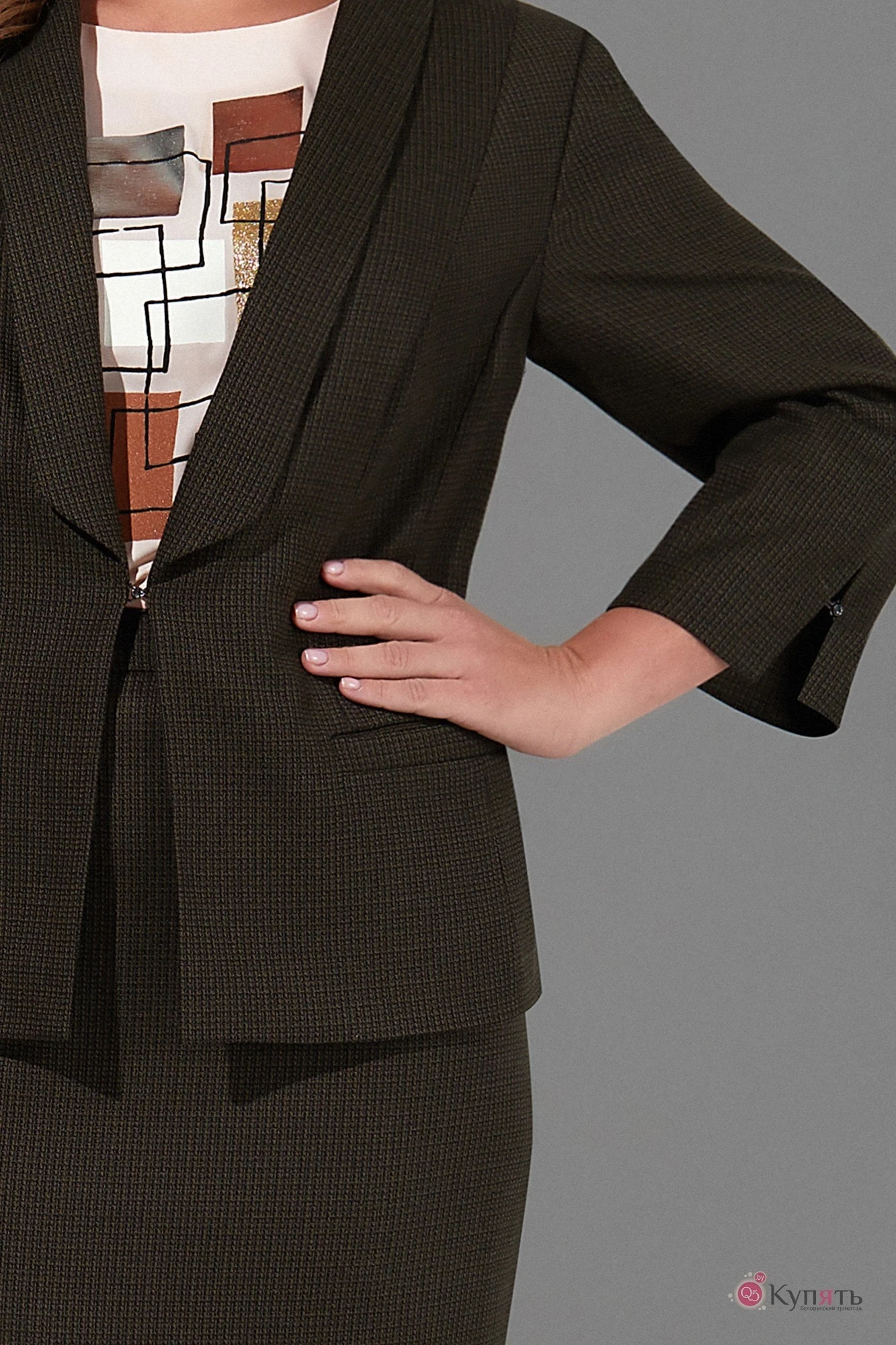 54,56,58Дизайнерский юбочный костюм с авторским принтом на блузке выполнен из костюмной ткани, универсальный комплект впишется в любой гардероб и подойдет на все случаи жизни. Жакет прямого силуэта с V-образным вырезом и шалевым воротником застегивается на декоративный крючок (клевант). Перед оформлен вертикальными рельефами от плеча до листочек . Спинка со средним швом . Рукав втачной свободный, по низу с разрезом и застежкой на крючок. Блузка прямого силуэта с с округлым везом и нагрудными вытачками . Перед украшен авторским геометрическим принтом в смешанной технике. По спинке обработан разрез с застежкой на пуговицу. Рукав втачной. Юбка карандаш с отрезным поясом по бокам на резинке, застежка на пуговицу и потайную молнию в среднем шве спинки, по низу юбки шлица. Жакет и юбка на подкладке.