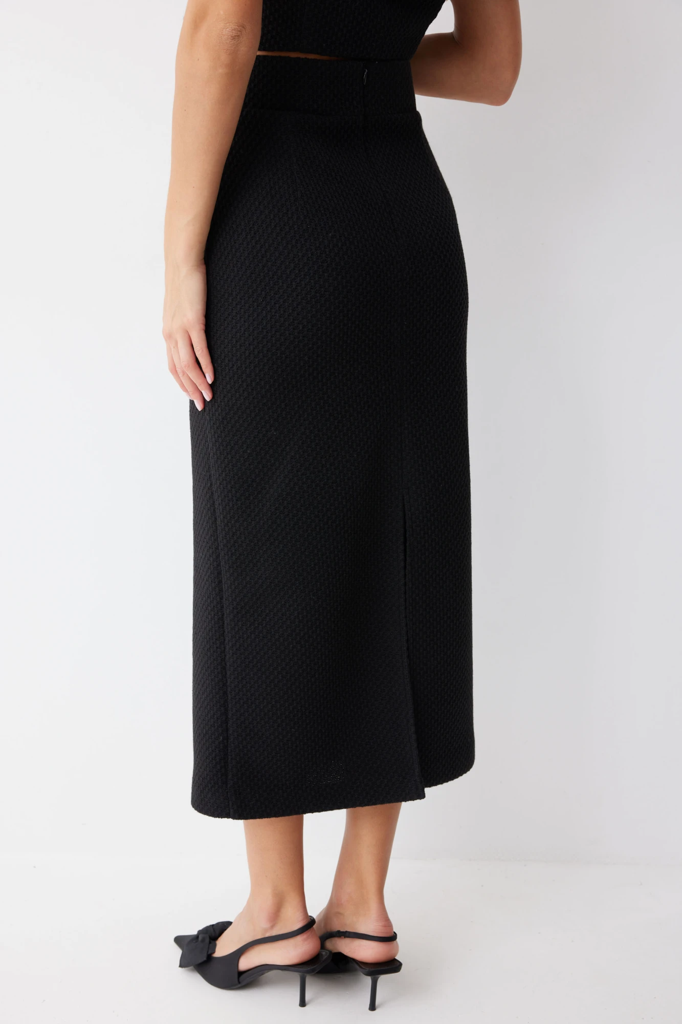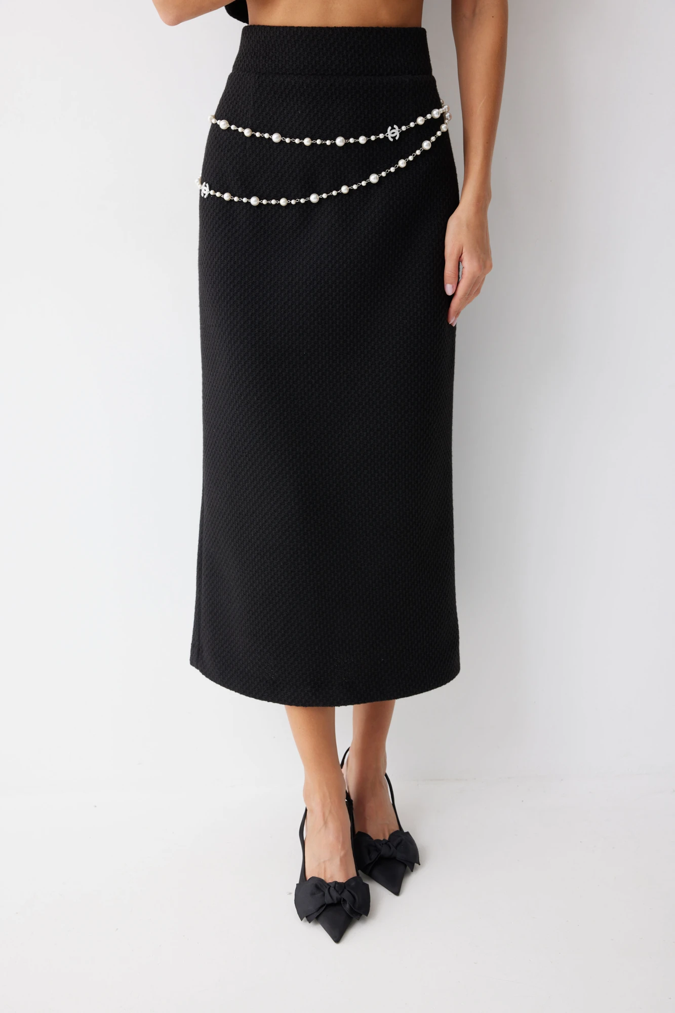 Юбка прямого силуэта из трикотажного полотна. По верху юбки притачной пояс. На спинке юбки в центральном шве застежка на потайную молнию, по низу разрез. Юбка на подкладке."