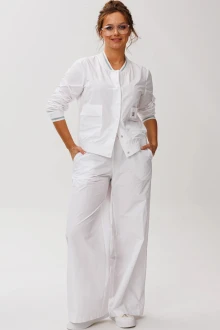 Костюм женский из льна – вишера, состоящий из жакета и юбки. Жакет полуприлегающего силуэта с центральной застежкой на четыре петли и пуговицы. По переду рельефы от плечей до подреза, в который вставлена листочка с молнией. В рельефе от проймы – отделочный кант. Горловина обработана фигурной планкой из отделочной ткани. Спинка стачная по среднему шву с рельефами от плечей до низа. Рукав одношовный втачной с отрезной манжетой. В шов притачивания манжеты вставлен отделочный кант. Юбка прямая на притачном поясе со шлицей. По переднему и заднему полотнищу талиевые вытачки. По боковым швам резинка. Потайная застежка – молния в центральном среднем шве заднего полотнища.