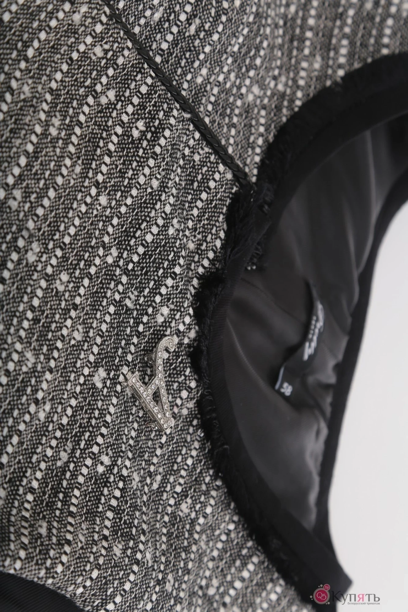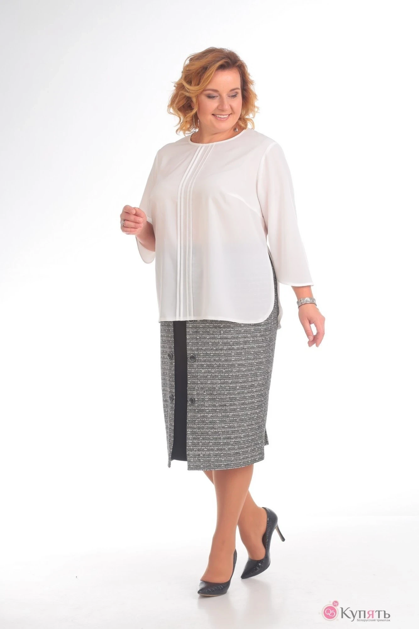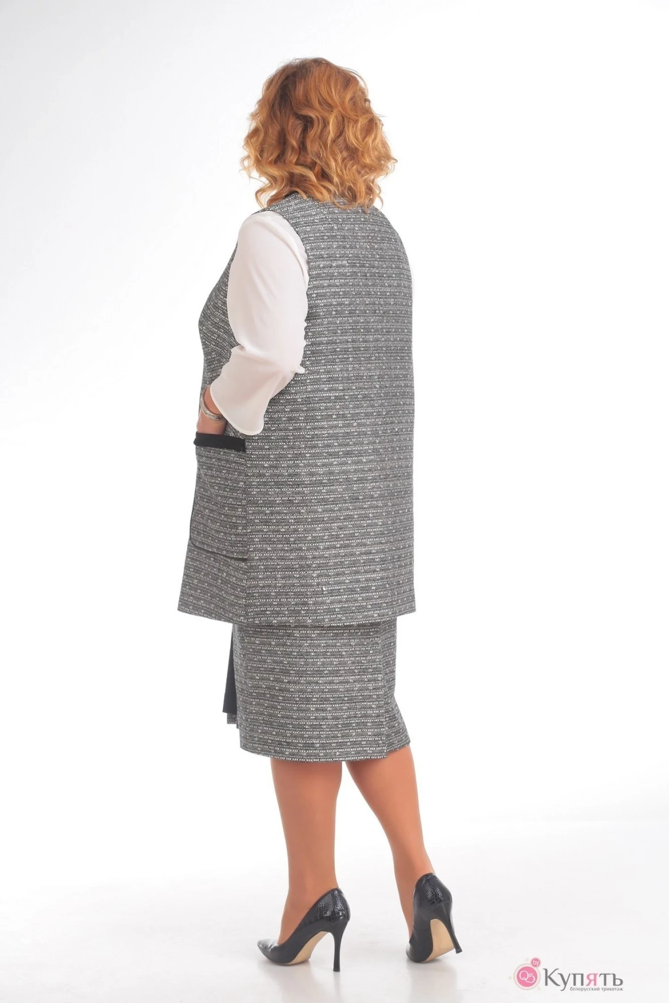 Комплект из блузы, жилета и юбки. Блуза с округлой горловиной, спереди застрочены узкие вертикальные защипы. Рукава втачные, одношовные с фигурным низом. Низ переда и спинки закруглен у боковых разрезов. Спинка со средним швом. Жилет распашной, без застежки. Спереди обработаны нагрудные вытачки и накладные карманы. Спинка со средним швом. Горловина, края бортов и карманов декорированы кантом. Юбка немного заужена к низу. На переднем полотнище обработаны талиевые вытачки и центральная вставка из другой ткани. Заднее полотнище со средним швом, застежкой на молнию, шлицей и талиевыми вытачками. Пояс притачной, на резинке. Жилет и юбка на подкладке.